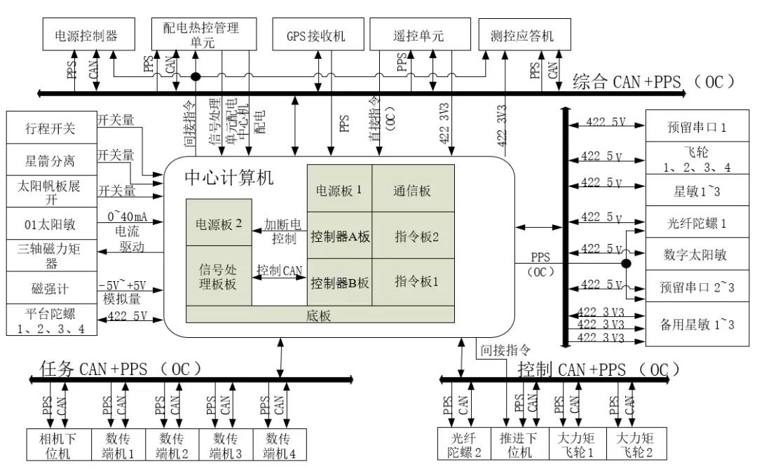 其中控制器板A板和控制器板B实现中心计算机的主控功能,它们是中心计算机的核心;通信板实现计算机扩展外围接口,这里的外围接口主要包括异步串口和测控同步串口的扩展,通过接口扩展可以实现中心计算机与星上其他设备的控制器之间直接通信;指令板主要实现多路间接指令功能。直接指令一般指由测控分系统直接发出控制星上各个设备的指令,间接指令是测控分系统发给中心计算机,再由中心计算机发送给星上各个设备的指令,这里的间接指令指的是OC指令;信号处理板实现磁力矩器的控制功能及模拟量的采集功能;电源板实现控制器板、通信板、信号处理板、指令板的配电、数字量和开关量的接口功能;底板作为总体内部连线,将各个单机电路连接为一个整体。