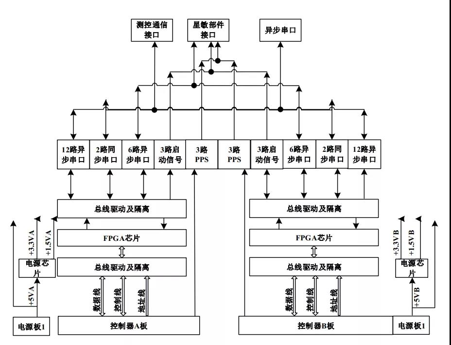 综合电子学系统一般包括控制器核心部分、通信接口部分、指令接口部分和信号处理部分组成。控制器核心部分类似于个人电脑的CPU部分,用以实现计算机的控制,下面是某卫星综合电子学结构实例,我们将针对实例介绍它的各部分结构和功能。