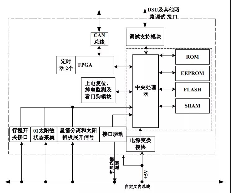 控制器板模块的核心功能是实现中心计算机的主控功能,这是综合电子学分系统最核心的功能。控制器板模块结构主要包括CPU最小系统、上电复位、掉电监测及看门狗、CAN总线、时间管理、调试串口、二次电源变换、星箭分离及太阳帆板展开信号采集等功能。控制板模块在设计过程中要着重注意技术上的继承性,控制器板的结构框图如下。