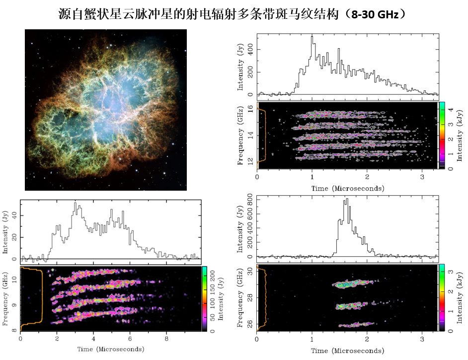 可能读者要问了:说好的蟹状星云脉冲星呢?下图给出哈勃望远镜拍到的蟹状星云多波段合成图像,其它图为该脉冲星射电辐射中间分量(interpulse)频谱数据所展示的完美条带,从5GHz一直到30GHz共计30条左右。这些条带有可能会延伸至更高频率,但应该是还没有相应观测数据。有趣的是,各频带间距随频率增加而线性增加,与前面所介绍的太阳和木星斑马纹性质类似。这颗脉冲星每33ms转一圈。据言,观测者观测了20余年,已转了很多很多圈,但上述特征没有发生明显变化!