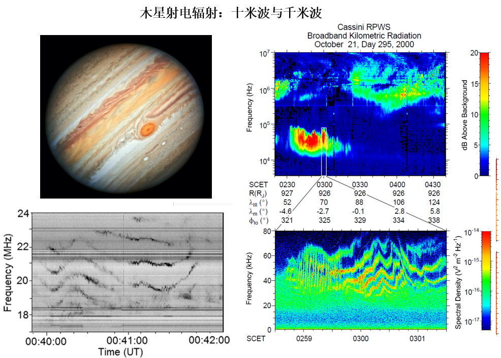 左上图是哈勃望远镜于2019年6月27日拍摄到的木星照片,左下为乌克兰太阳射电望远镜记录到的木星十米波斑马纹;右侧为卡西尼飞船在2000年10月21日记录到的射电辐射。
