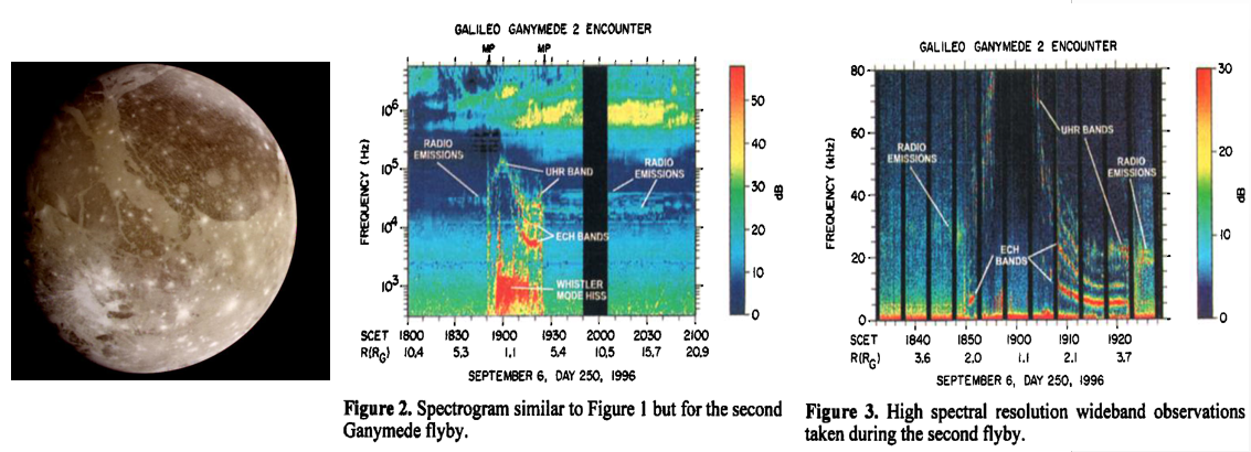 以上观测说明等离子体波场的多带特征是普遍存在的。确实,在木卫三(Ganymede)附近也探测到了。木卫三是太阳系百余颗卫星中最大的一颗,也是迄今发现的唯一具全球内禀磁场与磁层的卫星。下图展示了伽利略飞船于1996年拍到的木卫三本尊及相应的等离子体波场频谱数据,其中的带状结构清晰可见(Kurth et al. 1997 GRL)。