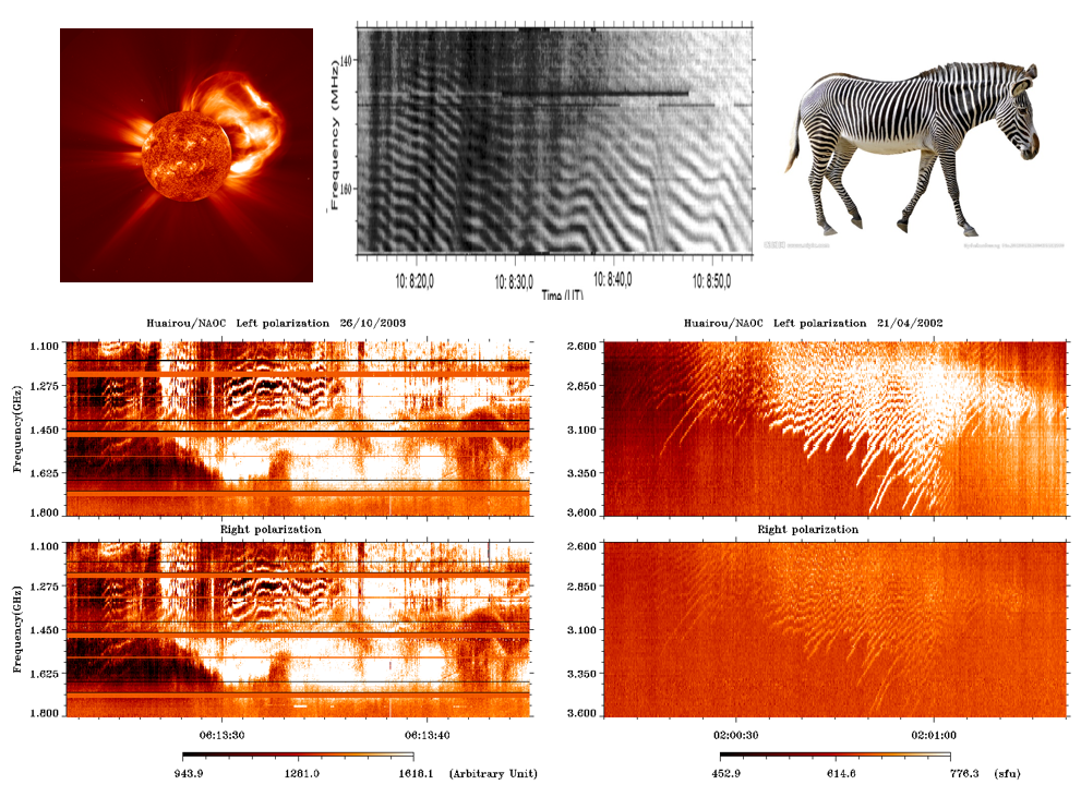 为比较,上图右上角还展示了一匹斑马的靓照!可见,多纹曲延并行、又如爆竹烟花,甚是惊艳。下面一组图是由我国国家天文台怀柔太阳射电观测站测得的,上图右上方太阳图像由SDO-SOHO卫星数据制成;上方中图为在米波段观测到的斑马纹(Zlotnik et al. 2003 A&A)。
