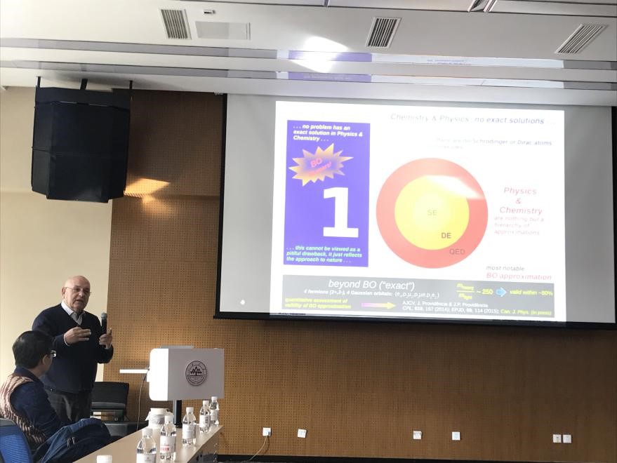 报告中,Varandas教授首先用类似氢分子的四粒子系统对玻恩-奥本海默近似进行简要介绍,随后对外推法(extrapolation techniques)可能有助于减轻电子结构和动力学的计算量进行了详细说明。