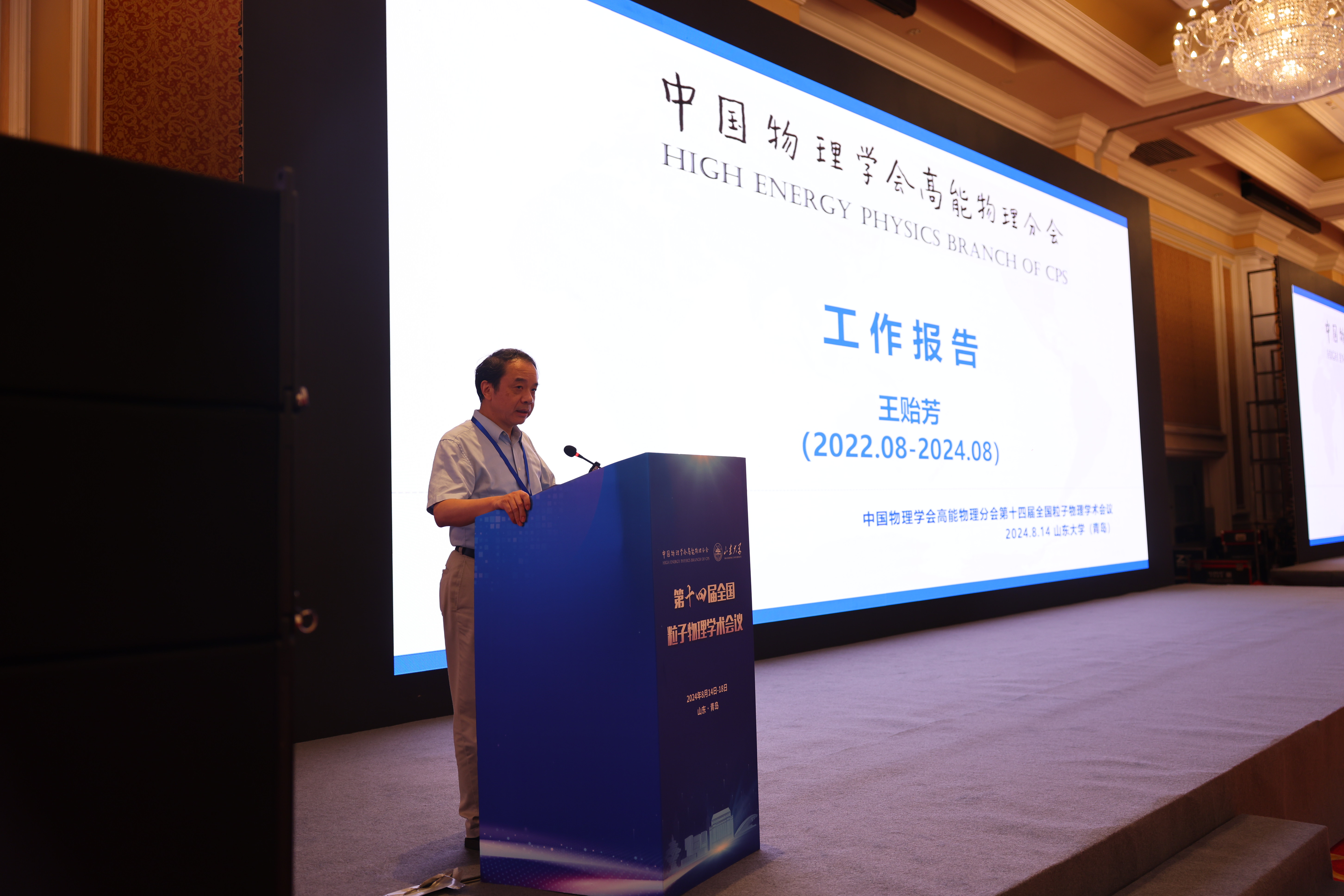 王贻芳院士代表中国物理学会高能物理分会委员会作工作报告,介绍了分会情况和大会组织情况,阐述了我国高能物理发展面临的机遇和挑战,以及高能物理领域重大科技基础设施战略研究情况等。