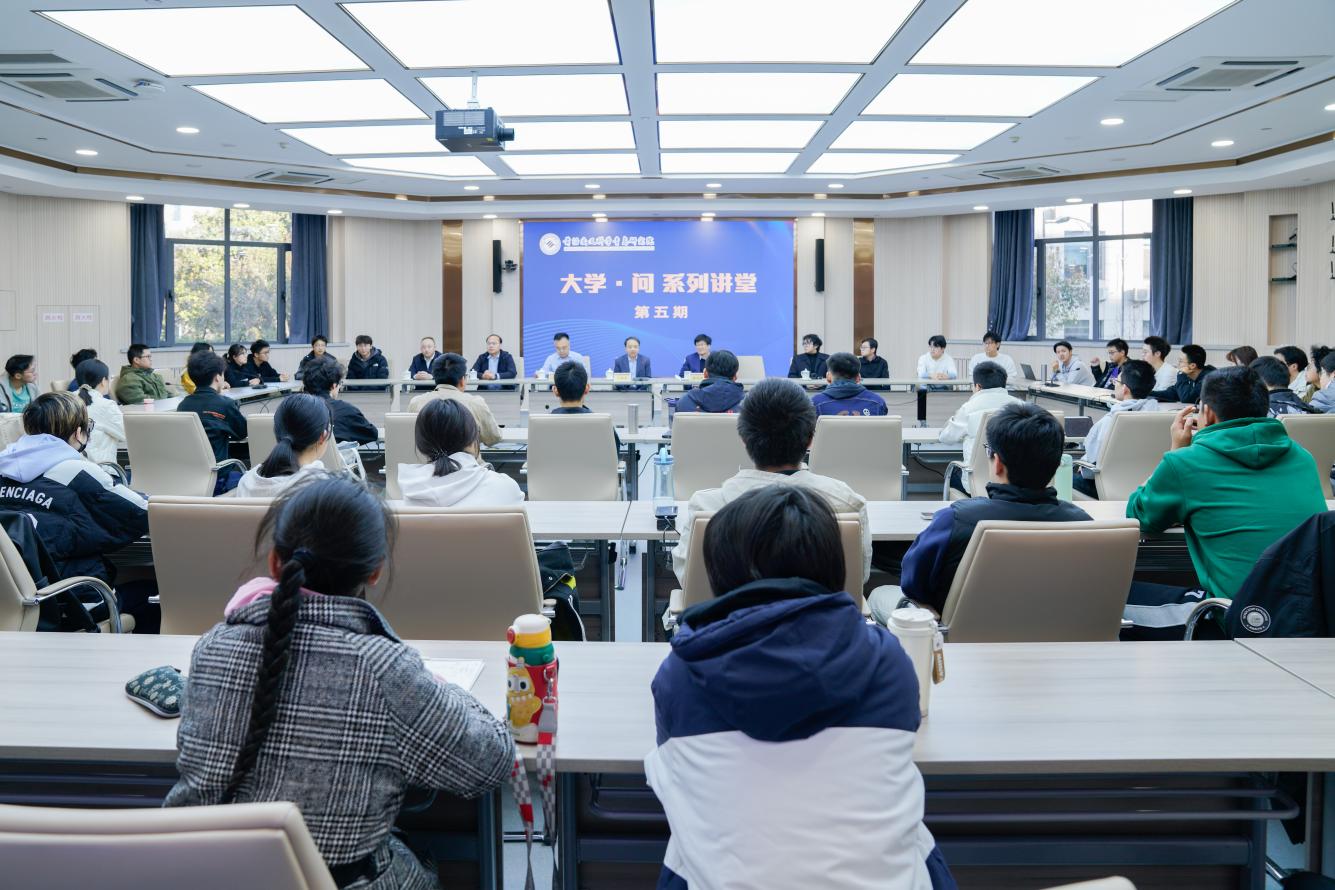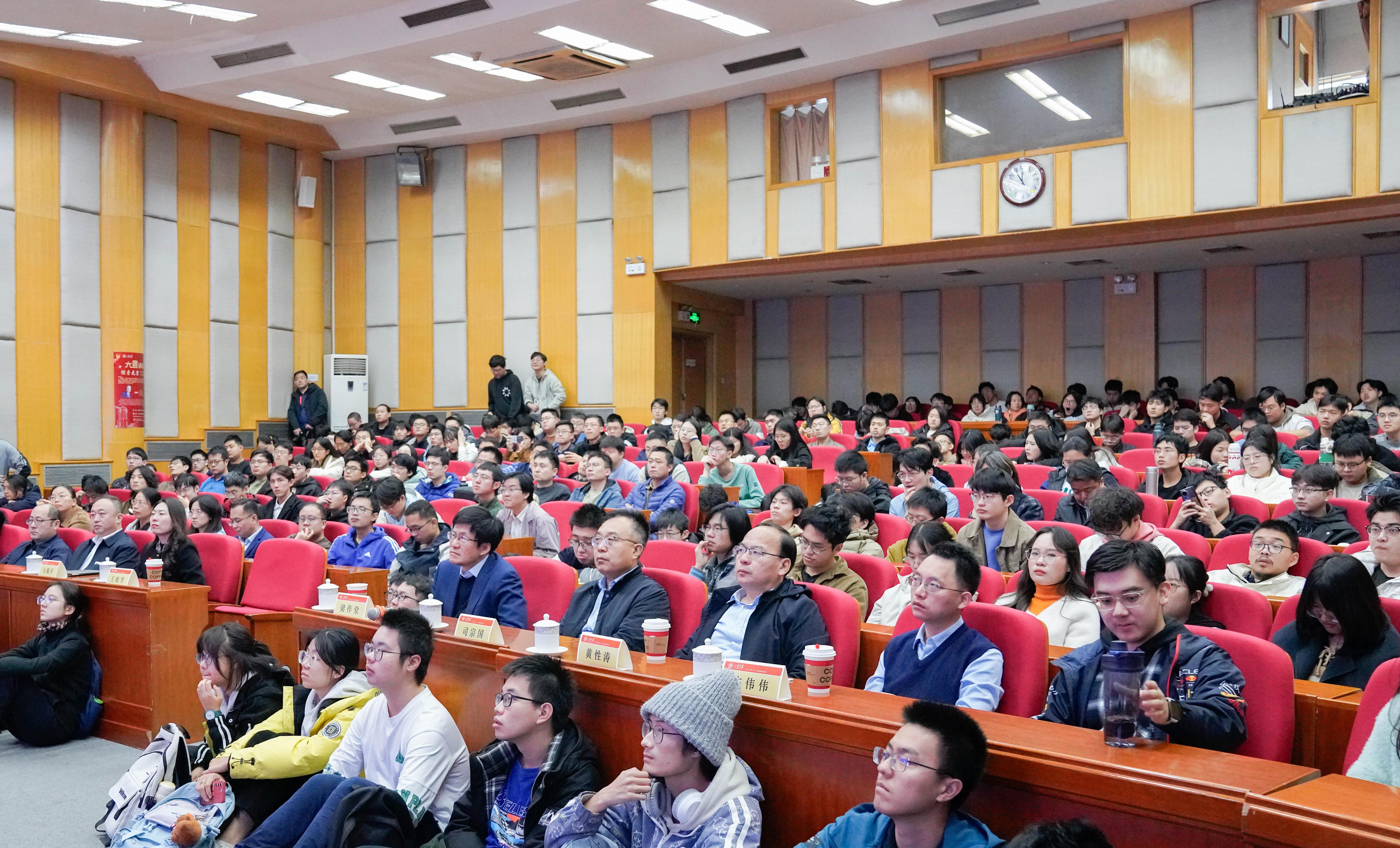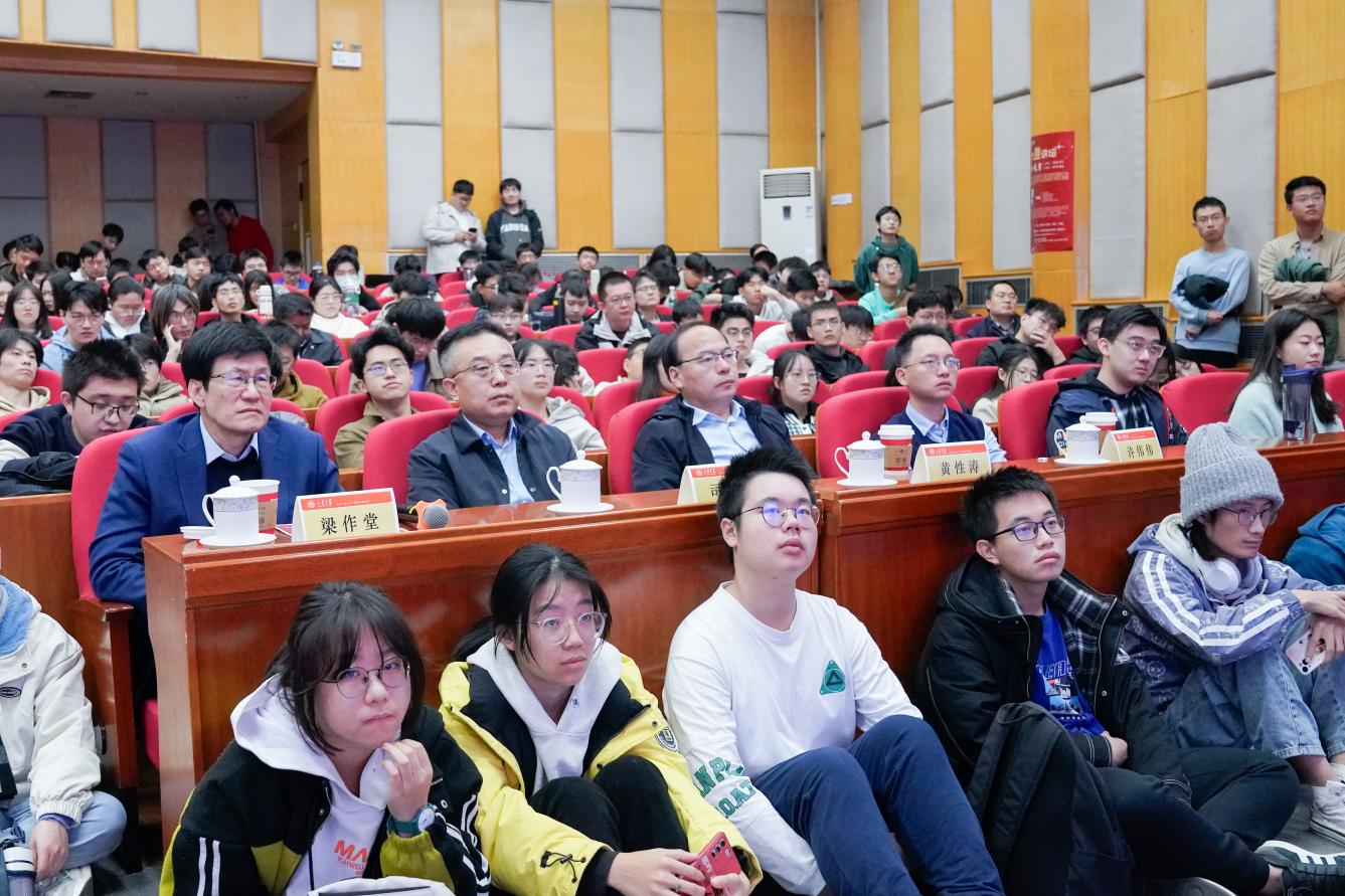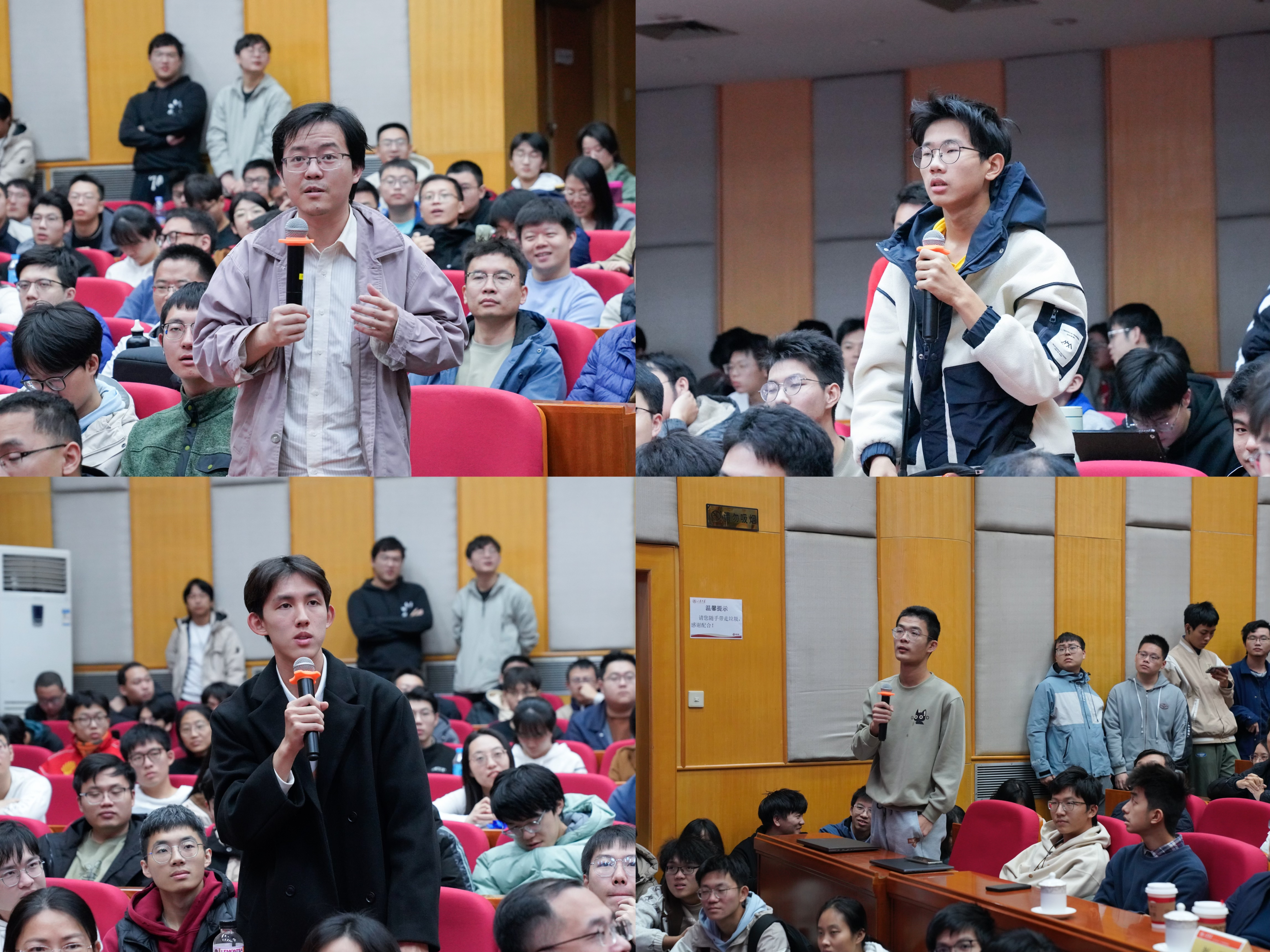 王贻芳院士对粒子物理未来发展方向进行了解读,对我国在北京正负电子对撞机/北京谱仪III实验(BESIII)、大亚湾中微子实验(Daya Bay)等国际大科学工程中做出的重大成果进行了详细介绍,展示了我国牵头自主设计研制、即将运行取数的江门中微子实验的进展情况。他以我国正在预研的环形正负电子对撞机(CEPC)为例表示,中国的粒子物理研究正处于从追求“一席之地”到“成为领跑者”的历程,勉励在场师生坚持“四个面向”,为实现高水平科技自立自强不断作出应有贡献。王贻芳院士还逐一解答了现场师生的提问,并就现场师生关心的话题进行了互动。