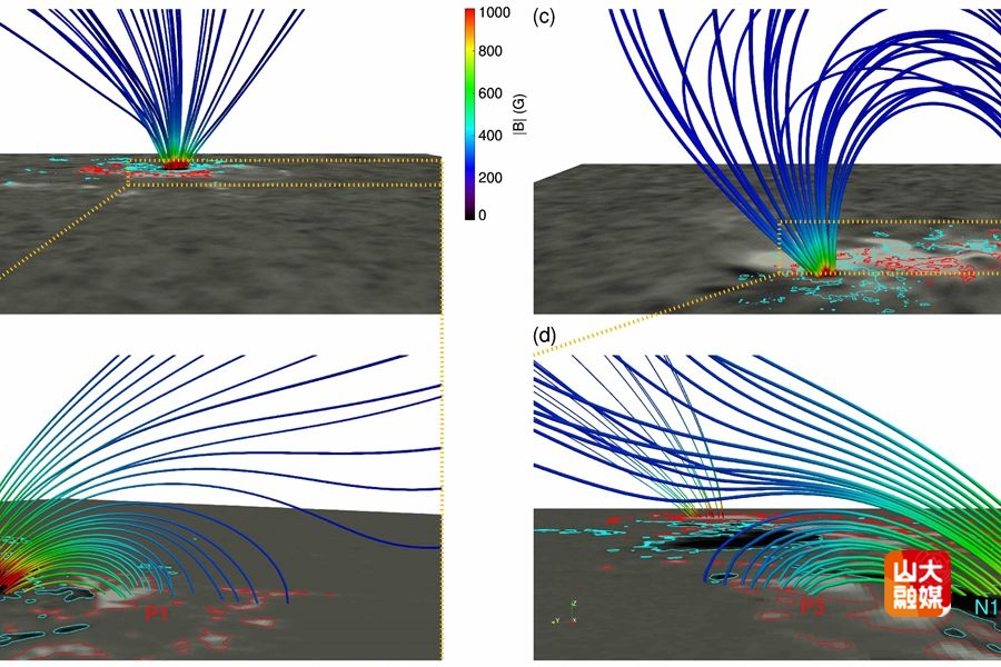 团队成员基于“羲和号”卫星、全球振荡网络组Hα及SDO磁场数据,系统分析了SDO观测到的所有X/M级耀斑伴随的莫尔顿波事件, 将莫尔顿波样本数从10余例扩展至66例。发现超过80%的莫尔顿波发生于活动区边缘,且爆发呈非径向传播,该结果支持爆发源区倾斜磁场结构是莫尔顿波产生的关键(图2)。该成果以“The Magnetic Origin of the Mystery of Rare Hα Moreton Waves”为题近日发表于美国天文学会《天体物理学杂志》。前沿交叉科学青岛研究院空间天文物理融合中心博士后钟泽为论文第一作者,空间科学与技术学院陈耀教授为通讯作者。