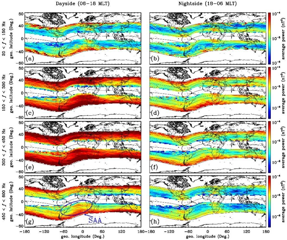 该研究通过统计结果,证实了南大西洋磁场异常区对等离子体层嘶声波分布具有显著影响,明确了异常区内低频嘶声波功率增强现象及其季节性变化特征。这一发现不仅完善了对等离子体层波动分布规律的认识,也为深入理解内磁层波粒相互作用和辐射带动态演化提供了重要的观测依据。