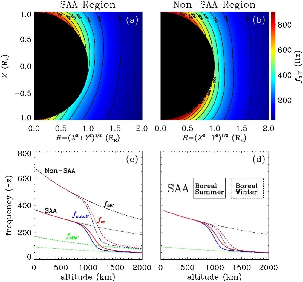 朱辉教授带领课题组成员,基于范艾伦探测器2013–2018年期间的更广空间覆盖范围的波动磁场数据,对L < 2区域内的等离子层嘶声波分布进行了统计分析,从日夜差异、经度分布以及季节差异等多个维度分析了南大西洋磁场异常区附近嘶声波的分布特征。结果表明,频率低于600 Hz的等离子体层嘶声波在南大西洋磁场异常区附近会出现一个波功率的峰值,且其强度在北半球的夏季显著强于冬季。理论分析发现南大西洋磁场异常区附近的嘶声波功率峰值及其季节演化是由磁场差异和离子组成变化引起的交叉频率和截止频率的变化所致。