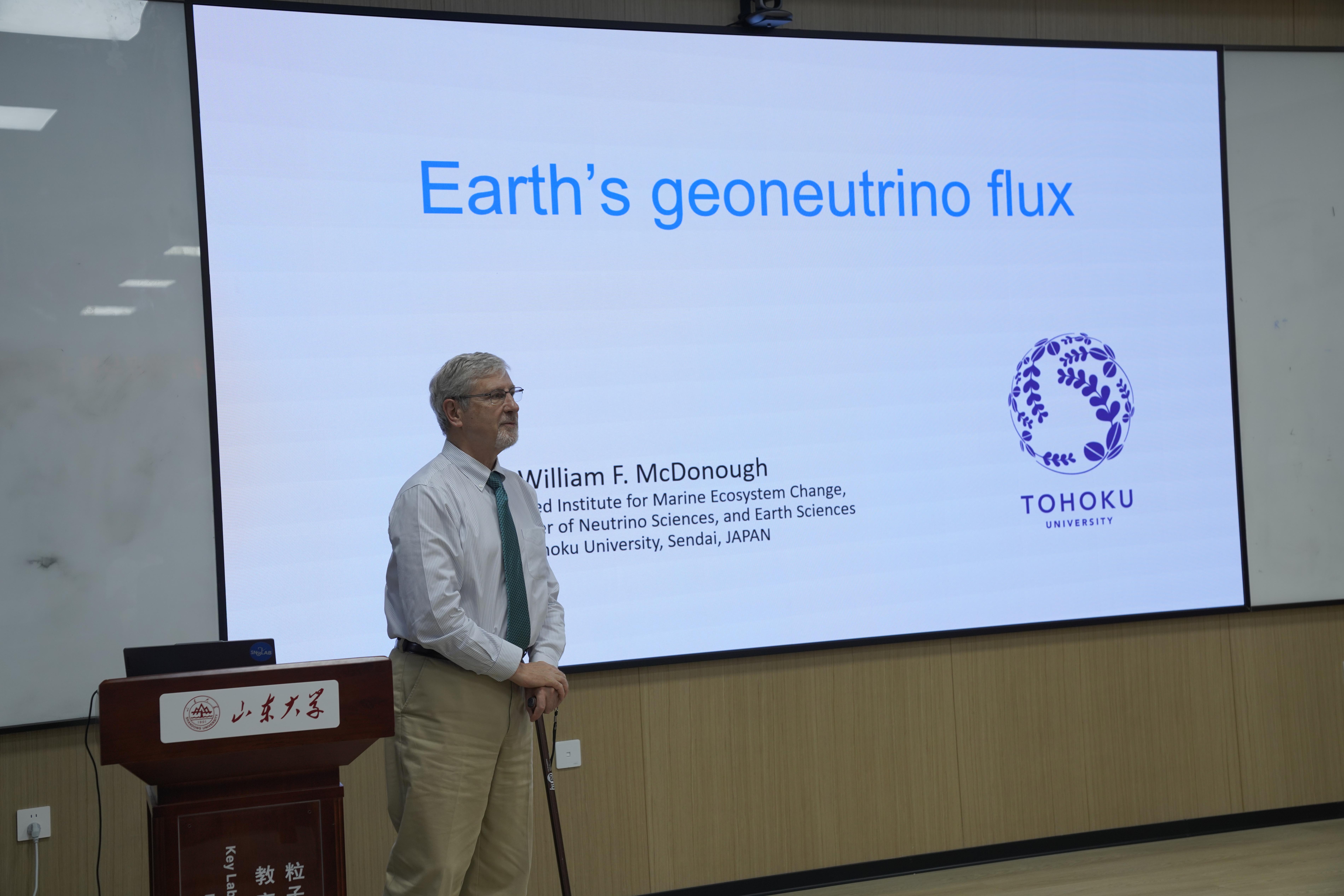 随后McDonough教授在第周苑122报告厅作专场学术报告。介绍了地热起源之谜、基于地质学和中微子测量建立交叉探索的必要性和紧迫性,以及现今和未来中微子实验将如何推进地热研究。