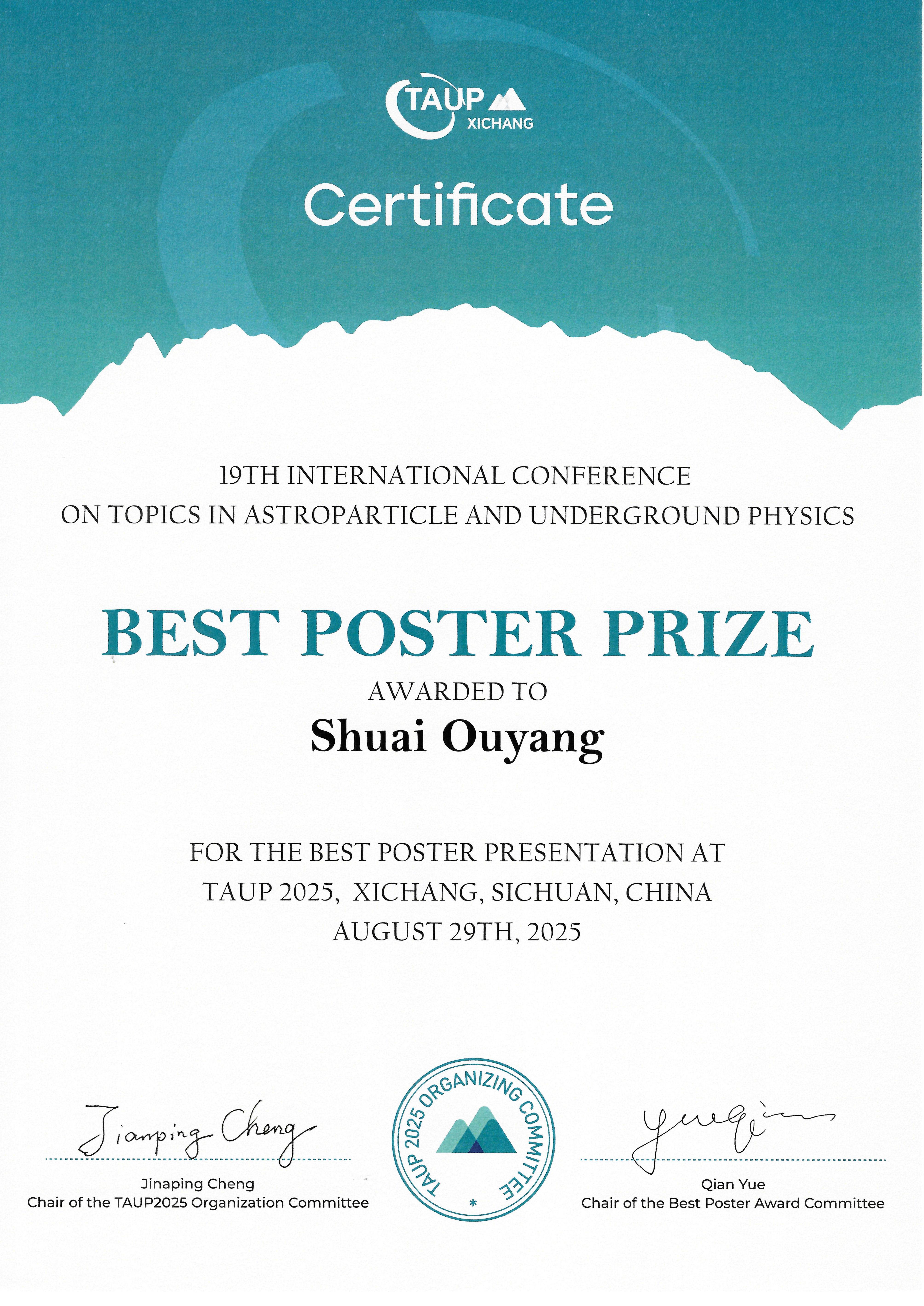 TAUP会议每两年举办一次,本届会议于2025年8月24-8月30日在中国四川西昌召开,组委会包括清华大学、北京师范大学、中国科学技术大学、中科院理论物理所、亚太理论物理国际中心和雅砻江水电发展有限公司,会议受到国家自然科学基金委员会、中国物理学会、中国物理学会高能物理分会和IUPAP(国际理论和应用物理学联合会)的资助。今年的TAUP会议汇聚了来自全球的学者与青年研究人员共约600人,围绕中微子物理、暗物质探测、宇宙线物理及相关地下实验等领域进行深入交流。博士生欧阳帅的研究成果在大会上受到同行的积极关注,展现了我校研究生在国际学术交流中的良好风貌。