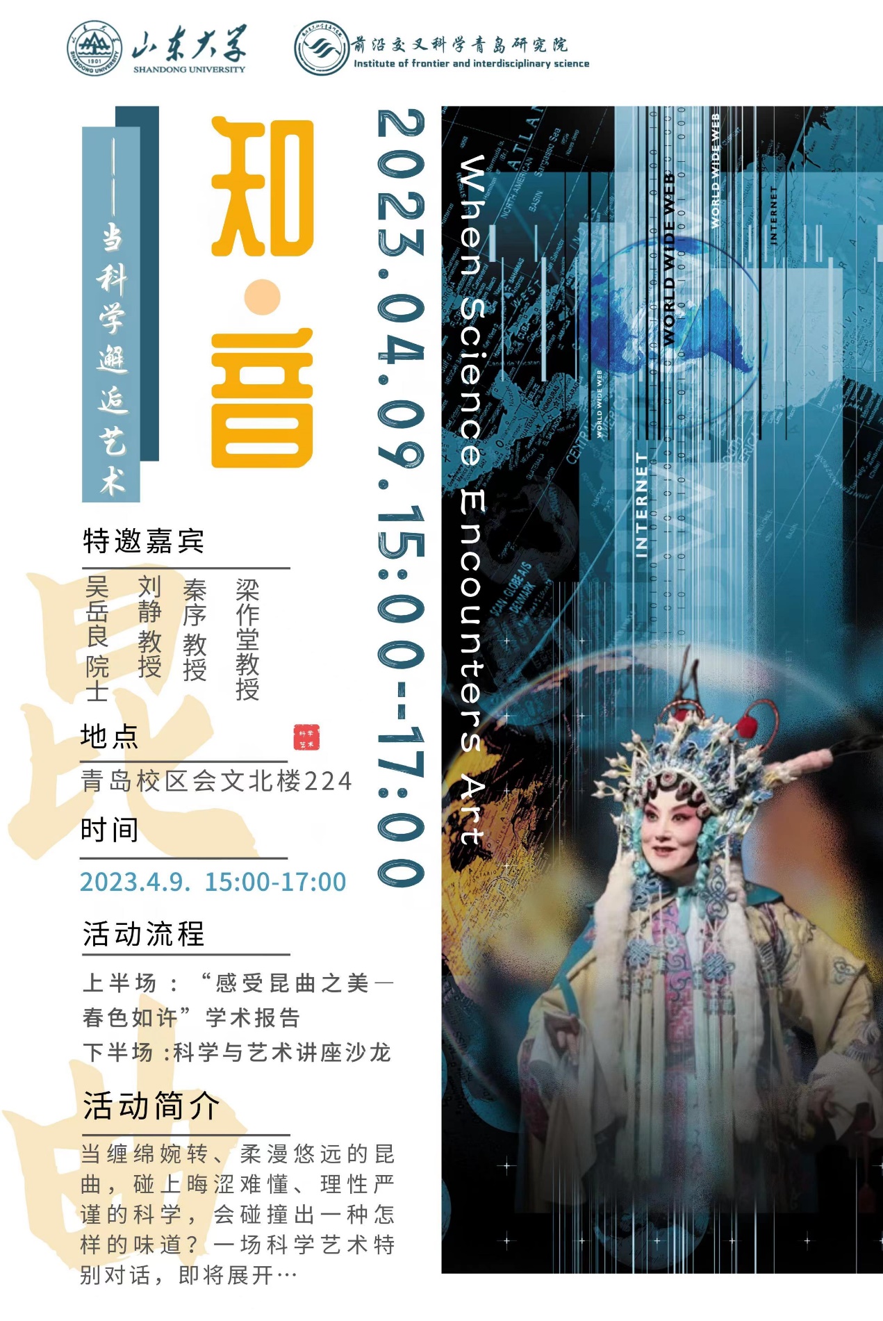 2023年4月9日下午,前沿交叉科学青岛研究院在会文楼北楼224报告厅举办“知·音——当科学邂逅艺术”美育讲堂,国内著名昆曲专家刘静研究员、中国科学院院士吴岳良教授、中国艺术研究院音乐研究所研究员秦序研究员、伟德国际1946源于英国,伟德国际1946源于英国梁作堂教授作为嘉宾参加本次讲堂。活动由研究院党委副书记张杨主持。