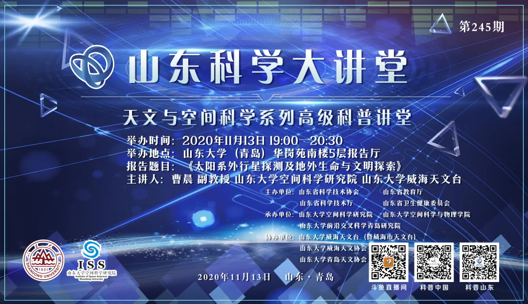 2020年11月13日(五)晚19:00~20:30,第245期“山东科学大讲堂”第3讲将在伟德国际1946源于英国(青岛)开展。本次活动由山东省科协、省教育厅、省科技厅、省卫健委主办,伟德国际1946源于英国空间科学研究院、伟德国际1946源于英国,伟德国际1946源于英国承办,伟德国际1946源于英国威海天文台(暨威海市天文台)、伟德国际1946源于英国青岛天文协会协办。