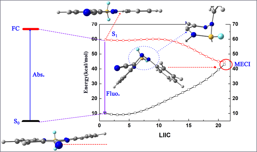 通过大量的实验与理论研究,目前研究人员已经普遍认为可以用分子内运动受限(restriction of intramolecular motions, RIM)机理来解释AIE现象。这一机理认为在稀溶液中,AIE分子的激发态能量会被内部存在着的活跃的振动或转动消耗掉,从而导致较大的无辐射跃迁速率,因此就发光较弱或者不发光。而在聚集状态时,这些活跃的分子内运动将由于空间位阻而大大受限,因此发光增强。不过,仍有一些AIE系统的机理目前尚不清晰,而且也有与RIM机理完全不同的机理被提出。比如,2017年,Aprahamian等人(Nat. Chem. 2017, 9, 83−87)对一系列boron difluorohydrazone(BODIHY)衍生物的AIE机理进行了研究,提出了抑制卡莎规则(suppression of Kasha’s rule,SOKR)。他们认为BODIHY的第一电子激发单重态(S1)为暗态,其AIE发光来自于高电子激发态(S2或者S3)。根据卡莎规则,发光体的发光只能来自于最低激发态(S1或T1),虽然也有反例,即反卡莎规则的分子被报道,但反卡莎规则的条件十分苛刻,通常需要分子的S1和S2态之间具有较大的能量差,S2与S1态之间的Franck-Condon因子较小,以及S2态的跃迁振子强度远大于S1态等,并且几乎不涉及更高的电子激发态如S3等。周潘旺等人首先注意到Aprahamian等人所报道的BODIHY的激发态能级与反卡莎规则的苛刻条件相相距甚远。进一步,他们通过TDDFT理论计算证明了Aprahamian等人在2017年发表的论文由于使用了不恰当的理论计算方法从而误以为BODIHY的S1态是暗态,而实际上BODIHY的S1态是发光态。因此,用SOKR机理来解释BODIHY的AIE发光机制是完全不合理的。最后,周潘旺等人利用XMCQDPT2//CASSCF方法对BODIHY的AIE现象进行了详细研究并提出了一个全新的机理,restriction of flip-flop motion(ROFFM)。这个机理揭示了BODIHY在被光激发以后,会通过flip-flop motion形成一个伞状的锥形交叉点,该交叉点在溶液中低于Franck-Condon点,因此可以有效猝灭BODIHY发光,而当处于高粘度溶液或者晶体状态时,flip-flop motion将会被限制,从而增强BODIHY的发光。ROFFM机理可以非常好的解释实验所观察到的BODIHY的AIE现象。