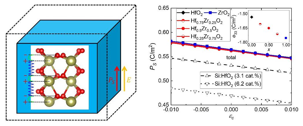 压电效应是指电介质中电场与力场相互耦合的现象。压电材料可以实现电能与机械能的相互转换,因而在精密传感/驱动等领域有广泛应用。二氧化铪(HfO2)是一类新兴的铁电材料,同当前半导体技术高度兼容,在微电子领域展现出重要的应用前景。大多数压电材料体现负横向/正纵向压电响应,这样的响应行为也符合预期。刘剑教授与刘仕研究员合作,发现二氧化铪呈现反常的负纵向压电响应并系统阐述了其微观机理。更为罕见且有趣的是,二氧化铪同时呈现负横向压电响应,这意味着其在外电场作用下会同时在三个维度膨胀或收缩。类比于奇特的“拉胀效应”(拉胀材料被拉伸时,不仅不会变细,反倒会变粗),研究人员首次提出了“电拉胀效应”以描述这一“有悖直觉”的压电响应,并结合材料基因组和数据挖掘发现了近百种压电材料均呈现“电拉胀效应”,揭示了这一现象的普遍性。该研究工作从基础研究的角度对于理解“压电性”这一具有一百多年历史的物理概念具有科学意义,从应用研究的角度则有望为微纳尺度的传感/驱动提供新的设计思路。