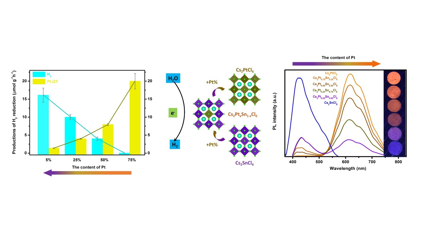 本工作中,该团队创新性的合成了一系列锡铂基钙钛矿Cs2PtxSn1-xCl6,通过调节Pt/Sn的取代比例,有效的调控了光学带隙,并在可见光区产生了第一激子吸收峰,打破了跃迁禁阻效应,实现了水中发光和光解水产氢的双应用。当Pt4+含量较多(x=0.75)时,该材料展现出宽光谱、长寿命、高效稳定的橙色荧光发射;当Pt4+含量极少(x=0.05)时,该材料具有更强的水稳定性和有效的光解水产氢活性,但是伴随而来的是减弱的荧光发光强度和降低的荧光量子产率。这一光学性能的切换调控与材料中亚带隙的形成有着密切的关联。研究人员通过紫外可见吸收光谱、变温荧光光谱和时间分辨荧光光谱,结合自主研发的泵浦-探测飞秒时间分辨光谱仪等手段,证明了材料中亚带隙的存在,同时揭示了自陷态荧光发射和光解水产氢两种不同模型中光生载流子的动力学进程。为开发复杂功能化的非铅钙钛矿材料提供了独特的研究策略。上述工作得到国家自然科学基金委人工光合成基础科学中心和国家自然科学基金重点项目等资助。