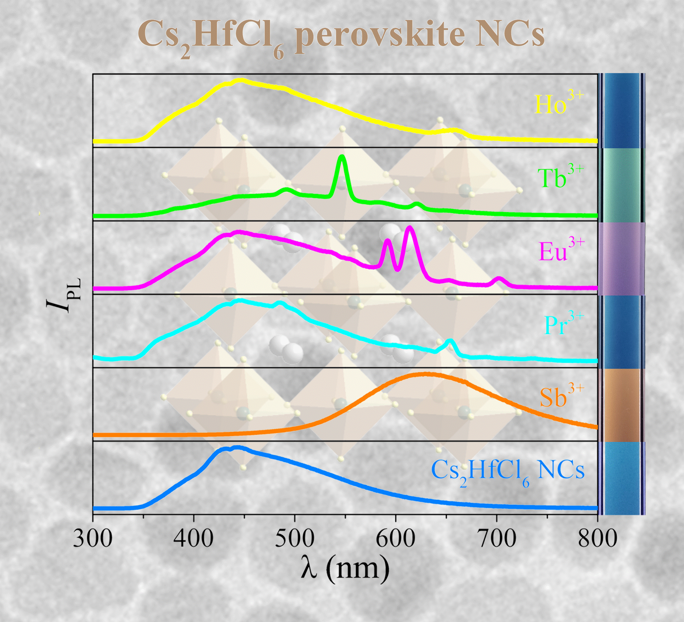 在该研究工作中,研究人员发现了金属乙酰丙酮化合物是一类非常合适的金属前驱物。研究人员采用Hf基空位有序钙钛矿作为模型体系和乙酰丙酮铪作为金属源,通过热注射法首次合成出Cs2HfCl6纳米晶。研究表明,不同于以往报道的钙钛矿纳米晶,Cs2HfCl6纳米晶是一种缺陷不容忍的半导体。Cs2HfCl6纳米晶的吸收光谱在波长240 nm和310 nm处展示出强烈的激子吸收特征。240 nm对应于Cs2HfCl6主体的带边吸收,而310 nm对应于由Hf4+或Cl-空位导致的亚带隙缺陷态的吸收。其荧光光谱展示出激发波长依赖的特征,在378 nm,444 nm,540 nm位置的发射峰分别来源于[HfCl6]2-八面体、杂质[ZrCl6]2-八面体和亚带隙缺陷态。针对Cs2HfCl6纳米晶中亚带隙缺陷态的问题,研究人员提出Sb3+辅助的钝化策略。Sb3+钝化缺陷在此前钙钛矿研究中未见有报道。接着,利用稀土乙酰丙酮化合物,研究人员成功将四种稀土离子(Pr3+, Tb3+, Eu3+, Ho3+)掺杂到Cs2HfCl6纳米晶主体的晶格中,并获得基于自陷激子到掺杂剂能量转移的多颜色发射(由蓝色到绿色到粉红色)。值得一提的是,与以前报道的稀土元素掺杂钙钛矿纳米晶体系相比,稀土乙酰丙酮化合物的使用实现了稀土元素离子在更温和环境下往纳米晶的晶格中的掺杂。最后,研究人员探索了这类新型钙钛矿纳米晶在X射线闪烁成像和白光LED方面的应用。