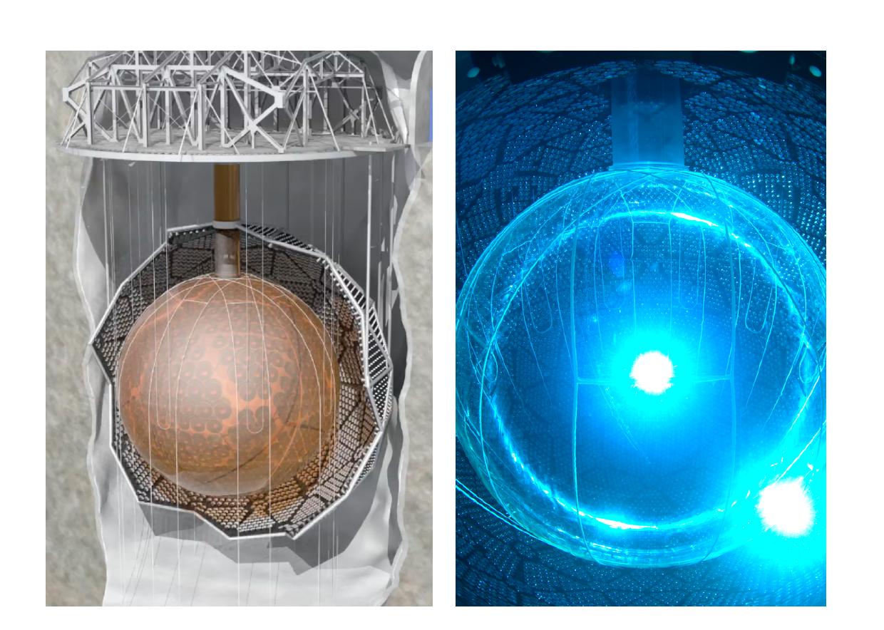 SNO+探测器的艺术照(左图)和内部高清相机拍摄的真实照片(右图)