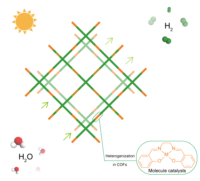 太阳能光催化分解水制氢是获得清洁氢能一条重要途径。近年来,利用多孔晶态共价有机框架作为高效的光催化剂受到研究者广泛关注。多孔共价有机框架的丰富孔道、大比表面积、可调结构组成都为光催化性能及机理研究提供模型平台。在共价有机框架光催化制氢研究中,构建有效的催化活性位点是提升催化性能的重要途径。为此,邓伟侨教授研究团队提出了将均相分子催化剂异相化构筑共价有机框架材料光催化剂的新策略,通过共价键连接Salen金属分子催化剂和捕光基团芘到共价有机框架的重复单元结构中,成功制备了一系列含有不同金属中心的晶态Salen基金属共价有机框架材料(Salen-COF)。Salen-COF中芘基单体光捕获剂和Salen金属催化活性中心之间紧密连接,且材料内部形成共轭体系,促进了光生电荷的传递与利用。其中,Co/Zn-Salen-COF表现出最佳的光催化析氢活性为1378μmol g-1h-1。该活性也优于先前报道的非贵金属基 COFs光催化剂。该工作为设计共价有机框架光催化材料的高效活性位点提供了新的思路。