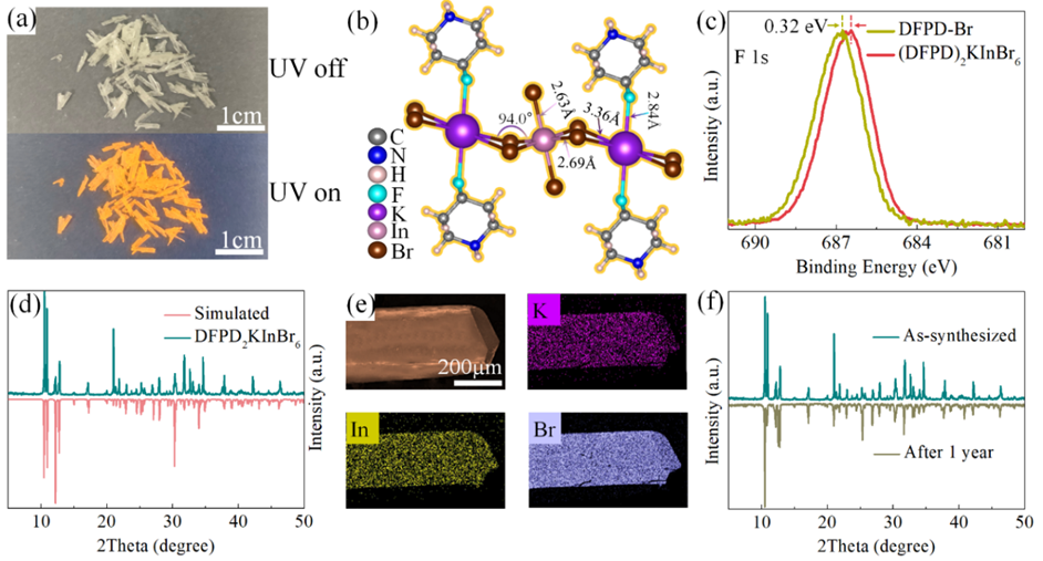 图1:(a)(DFPD)2KInBr6单晶在紫外灯下的发光照片,(b)模拟的晶体结构图,(c)F1s XPS能谱图,(d)实验和模拟的XRD谱图,(e)EDS元素分布图以及(f)空气中存放一年之后单晶的稳定性数据。