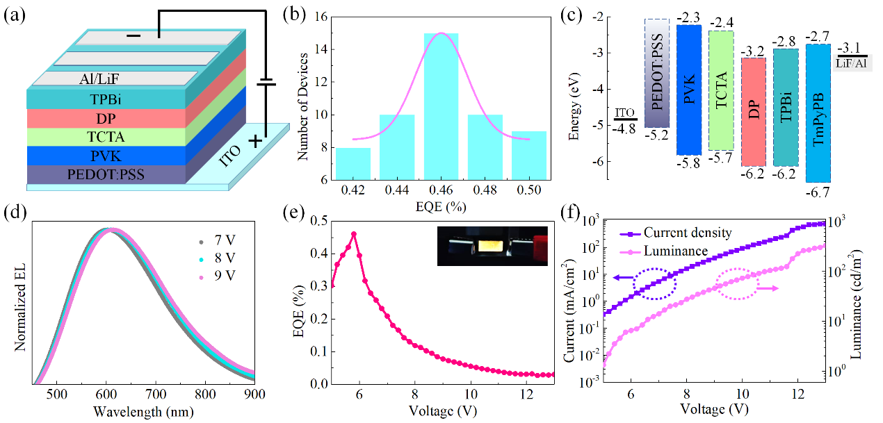 图2:(a)基于(DFPD)2KInBr6薄膜的LED器件结构图,(b)效率统计图,(c)LED器件能带结构,(d)不同偏压下LED的发光光谱,(e-f)LED器件的EQE和I-V-L特性曲线。
