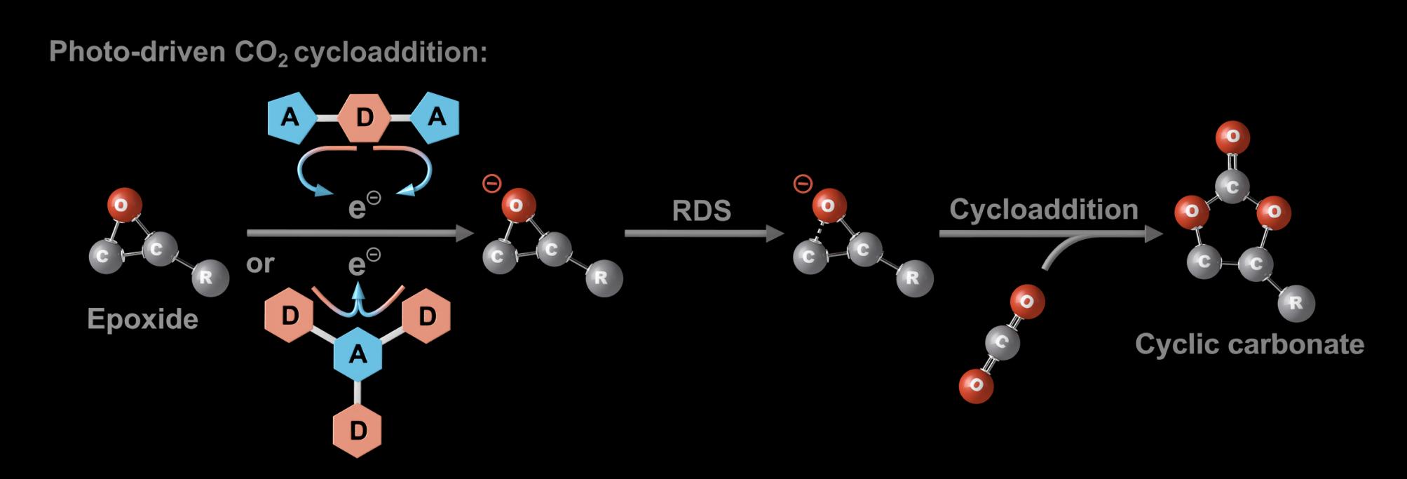 CO2与环氧化合物通过环加成反应制备环状碳酸酯是一类重要的CO2转化利用途径,该反应的原子利用率为100%。目前大多数情况下,该反应需要在高温高压和添加助催化剂的条件下才能高效进行,面临能耗高和产物难分离的问题。本工作提出利用太阳能为能量源促进CO2环加成反应,设计合成了一系列结构中含有电子给体-受体的聚离子液体催化剂,在无金属、无助催化剂和无溶剂的条件下光诱导反应高效进行。对于同一种催化剂,光诱导的CO2环加成反应转化率为热诱导反应的近5倍,机理研究表明,PILs中D-A结构的存在能够大幅度促进催化剂分子内光生载流子的分离效率和转移速率,将光生电子高效转移到环氧化合物上并促进其开环,进而加速CO2环加成反应。