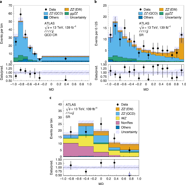 欧洲核子中心大型强子对撞机LHC上的ATLAS实验组近期于Nature Physics杂志上在线发表了关于首次观测到稀有ZZ双玻色子散射过程的论文[1],信号探测显著度[*]是5.7σ。这次的发现是粒子物理标准模型电弱测量中的一个里程碑,对理解希格斯机制(电弱对称性破缺机制)具有重要意义,获得审稿人、国际同行的广泛认可与报道。