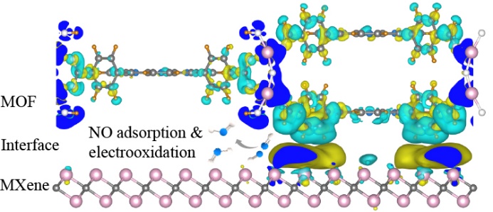 团队在前期工作中提出了MXene作为前驱体制备金属有机骨架(MOF)的新策略(J. Am. Chem. Soc. 2019, 141, 20037),实现了传统金属盐前驱体无法获得的纳米级MOF。在近期研究中,作者提出了MXene向MOF的非完全原位转化,成功获得MOF@MXene异质结构。其作为催化剂在电化学NO传感方面展现出高的灵敏度、稳定性和抗干扰能力。平面平均电荷密度差表明异质界面发生了大量的电荷重分布,产生了内建电场,有利于电荷转移。此外,基于分子力学的模拟退火计算表明,NO分子在异质界面上的吸附能明显高于单一组分的MOF和MXene。因此,加速的电荷转移和增强的NO吸附是NO电催化传感性能显著提高的根本原因。MOF@MXene异质界面的合理设计促进了先进电催化剂的发展和MXene材料的应用。