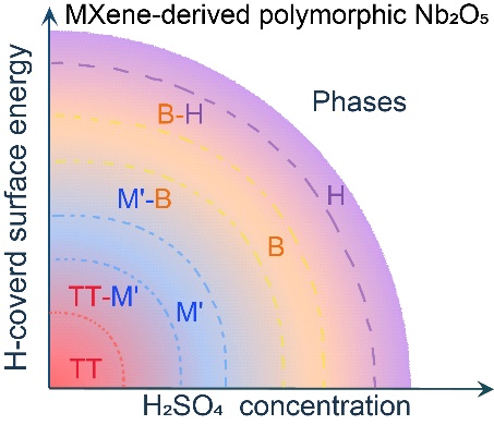 另一项研究则以Nb2CTxMXene作为前驱体,H2SO4为调节剂,首次实现在低温水热合成中调控Nb2O5的晶相。打破了只能通过高温煅烧(>400℃)调控Nb2O5晶相的常规。研究表明,与其他金属盐前驱体相比,MXene具有不可替代的作用。通过改变调节剂H2SO4的量成功制得4种不同微观结构的纯相Nb2O5和3种两两间的混相,且所需H2SO4的量与基于密度泛函理论计算的不同晶相的H覆盖表面能趋势一致。其中,由MXene衍生的B相Nb2O5观察到晶体切变现象,引发了丰富的氧空位,其作为锂离子电池负极所展现的容量是常规合成方法所得B相的3倍。该工作为合成常规方法难以获得的晶相材料提供了重要的参考。