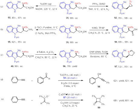 手性氨基醇54可以用作Ti催化的苯甲醛和炔基锌之间的亲核加成反应的配体,得到92% ee的手性醇产物。此外,产物40经过简单转化即可以良好的产率得到手性恶唑啉97。作者还将97作为手性配体应用于铜催化的苯乙炔和硝酮的不对称Kinugasa反应,生成手性四元环产物,证明了手性氨基醇和恶唑啉作为手性配体在不对称催化中具有应用潜力(Scheme 4)。