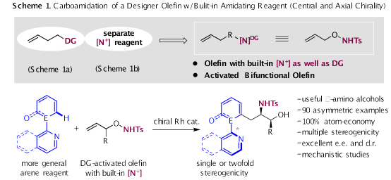 烯烃的双官能团化可以经济有效地合成含多个官能团的产物,为构建多样性的目标分子提供了丰富的合成方法。近日,前沿交叉科学青岛研究院分子科学与工程研究院李兴伟教授团队与合作者通过合理的底物设计,首次利用N-保护的O-烯丙基羟胺作为双官能烯烃,与三类(杂)芳烃进行不对称1,2-碳酰胺化得到手性氨基醇的反应。不对称碳酰胺化反应模式取决于(杂)芳烃试剂的性质。对于简单的非手性(杂)芳烃,反应得到具有优异对映选择性的中心手性β-氨基醇。而前轴手性或轴向外消旋杂芳烃的使用则可以合成具有优异对映和非对映选择性的轴+中心手性的氨基醇 (Scheme 1)。相关成果以“O-Allylhydroxyamine: a Bifunctional Olefin for Construction of Axially and Centrally Chiral Amino Alcohols via Asymmetric Carboamidation”为题,发表在国际知名期刊Journal of the American Chemical Society(中科院一区,TOP, IF=16.383)上。前沿交叉科学青岛研究院博士后米瑞杰为第一作者,李兴伟教授为通讯作者,伟德国际1946源于英国为第一完成单位。