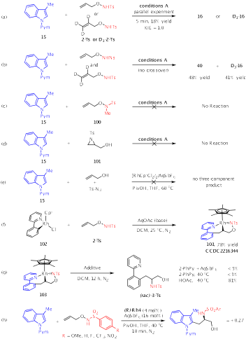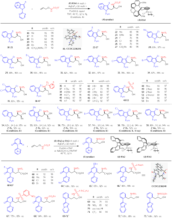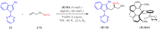 作者以N-嘧啶3-甲基吲哚与N-(烯丙氧基)-4-甲基苯磺酰胺2-Ts作为底物在手性铑催化剂催化下对反应条件进行了优化。通过对溶剂,添加剂及温度的筛选,最终在40℃下THF作为溶剂,叔戊酸作为添加剂,以手性三价铑(R)-Rh4作为催化剂能以91%的产率及98%的ee得到目标产物(R)-16。