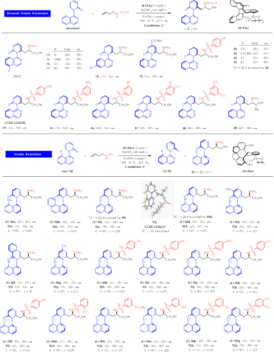 除了以高对映选择性合成中心手性氨基醇之外,作者也采用动态动力学转化和动力学拆分的策略,实现了轴加中心的手性氨基醇的高对映选择性及高非对映选择性合成(Scheme 3)。以N-异喹啉2-吡啶酮作为芳烃时,反应生成具有C−N手性轴外加中心手性的氨基醇。该反应利用(R)-Rh2作为最佳手性,异喹啉环不同位置吸电子或给电子基团的存在对反应活性及对映选择性的影响很小。对于带有更大位阻的8-取代的异喹啉定位基团的2-吡啶酮,由于芳烃本身具有轴手性,因此以动力学拆分模式与烯烃实现偶联。研究发现,不同取代的芳烃底物与各种烯烃的偶联都得到了良好的结果。回收芳烃的对映纯度普遍很高(64-95% ee),同时产物的对映选择性也很优异(93-99% ee),对应于63−618的s值。在上述所有反应中,产物的非对映选择性均为优秀(>20:1 dr)。