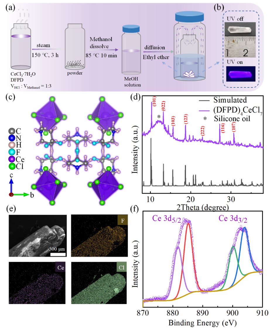 图1:(a)(DFPD)4CeX7单晶的合成过程示意图,(b)在室温和紫外光下拍摄的(DFPD)4CeCl7单晶的照片,(c)(DFPD)4CeCl7的晶体结构图, (d)实验和模拟的XRD图,(e)EDS元素分布图和(f)XPS能谱图