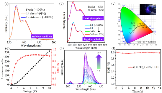 团队基于稳定的紫外发射、独特的抗热猝灭性能,以及异常高的荧光量子产率,成功制备了稀土下转换LED器件(图2)。在8 V的驱动电压下,最高外量子效率达到1%,并且在空气中连续工作840分钟后,仍能保持100%的初始效率,表现出了良好的实际应用前景。相关研究结果为设计新型稀土杂化金属卤化物功能结构拓展了新思路。