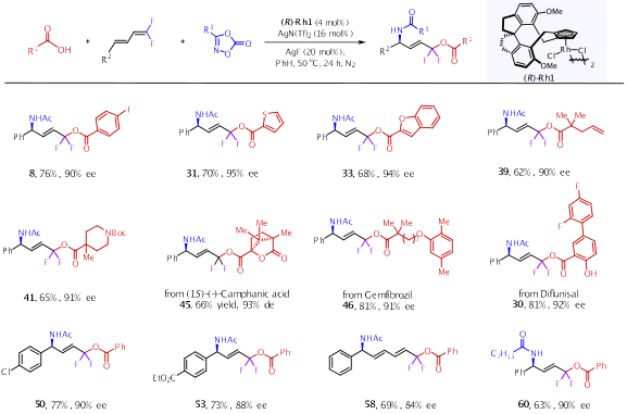 该反应不仅能有效兼容多种芳香羧酸和烷基羧酸及其衍生的多种药物分子,同时也适用于芳环上多种取代的偕二氟共轭二烯和不同类型的烷基二噁唑酮(图三)。