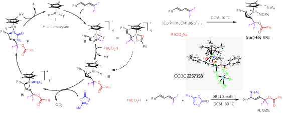 烯丙基金属物种具有热力学稳定和动力学活泼的特点。此前,该课题组利用此物种的性质已经实现普通共轭二烯(ACS Catal. 2021, 11, 6692-6697.)和1,3-烯炔(Angew. Chem., Int. Ed. 2020, 59, 22706-22713.)的不对称偶联反应。本文基于底物的巧妙设计,使得反应过程中生成的烯丙基金属物种(rac)-68中间体避免发生β-F消除副反应,实现了偕二氟共轭二烯的不对称1,4-氧胺化。化学当量实验成功得到了含氟烯丙基铑金属物种中间体,为反应机理研究提供了重要证据(图二)。