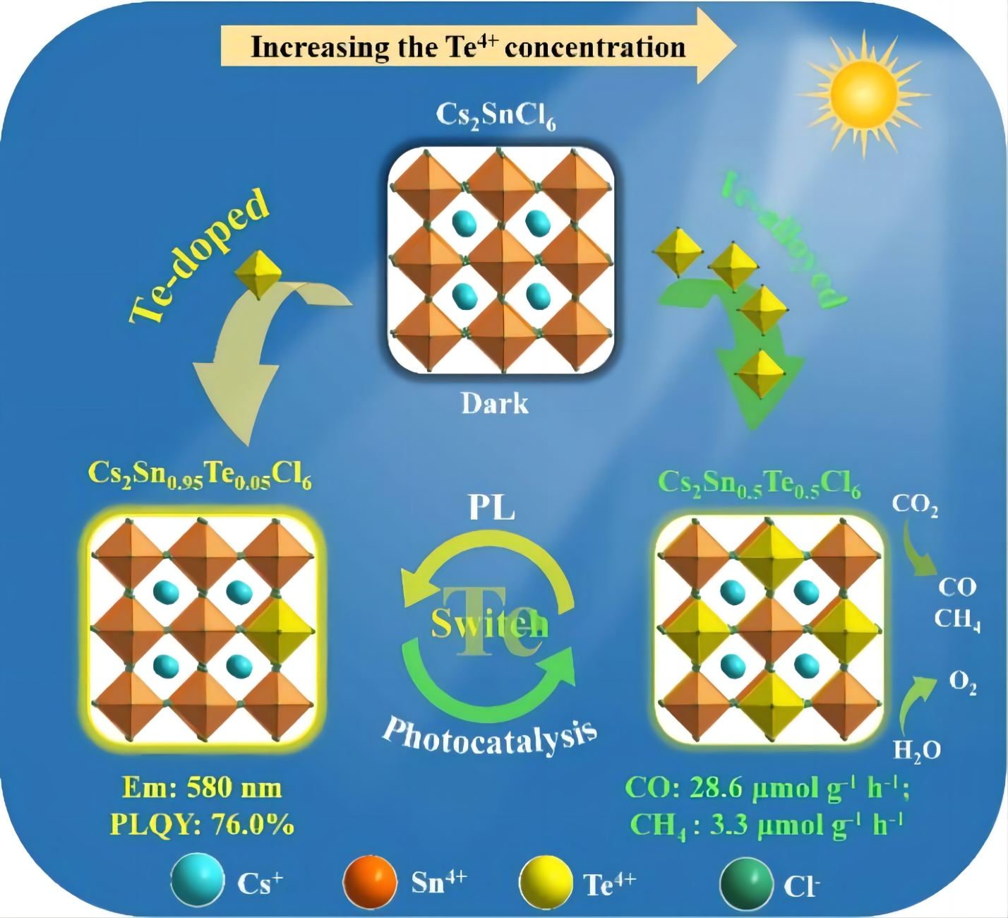 不同于其它非铅钙钛矿,Cs2SnCl6具有优异的水稳定性。然而,该材料中的本征偶极跃迁禁阻、较宽的光学带隙和体相缺陷等都严重限制了其进一步太阳能转化利用。该团队通过调控前驱体中Te4+离子的浓度,合成了一系列Te掺杂/合金化的Cs2SnCl6钙钛矿。研究发现,Te4+离子的引入打破了Cs2SnCl6主体材料中的偶极跃迁禁阻效应,当Te4+离子浓度较低时(~5%),主体材料中的电子局域程度增强,产生了基于自陷态激子发光机理的黄光发射;进一步增加Te4+离子浓度至~50%时,主体材料中的电子离域、电荷分离和转移能力得到增强,使其表现出良好的光催化CO2还原性能。此外,该团队通过改进合成方法,降低了材料中的体相缺陷浓度,抑制了非辐射复合过程,从而进一步提高了材料的光致发光和光催化CO2还原性能。