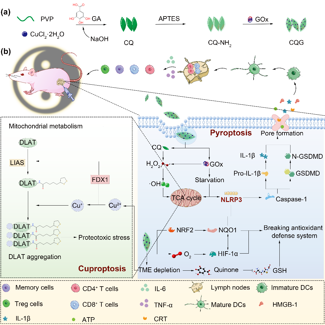 图: CQG NPs的合成路线以及诱导细胞焦亡和铜死亡协同激活免疫进而抑制休眠期和复发性肿瘤的机制。