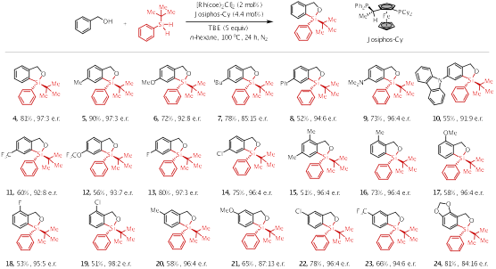 当以苄醇为底物,通过铑催化苄醇与二氢硅烷的脱氢偶联/串联C-H活化硅化反应,首次实现铑催化分子间C-H硅化反应构筑含硅立体中心环状化合物。该反应对各类取代基都有良好的耐受性,能够以较高收率、优异的对映选择性得到目标产物(图二)。此外,本文还研究了铑催化亚胺与二氢硅烷的不对称[4+1]环化反应,其中由于产物结构中包含Si-N键,不利于产物柱色谱分离,该反应目标产物用无机碱后处理,得到构型翻转的开环产物,对映选择性未衰减,该反应对带有各类取代基的亚胺底物也具有良好的耐受性(图三)。