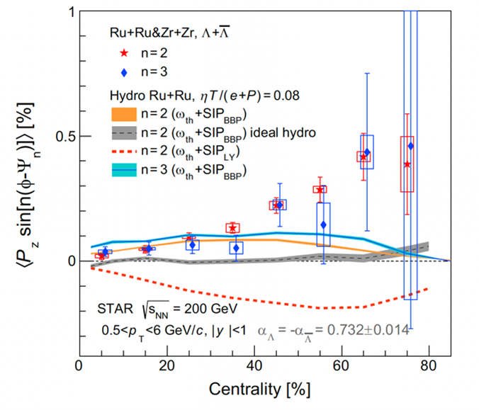 相对于二阶事例平面和三阶事例平面的局域极化随着碰撞中心度的增加呈现明显的增大趋势(图2),目前流体力学模型能够定性地描述局域极化的方位角依赖,但是并不能很好地解释局域极化的碰撞中心度依赖。这些新的实验结果为研究重离子碰撞中的自旋极化和涡旋效应提供了重要的实验数据。