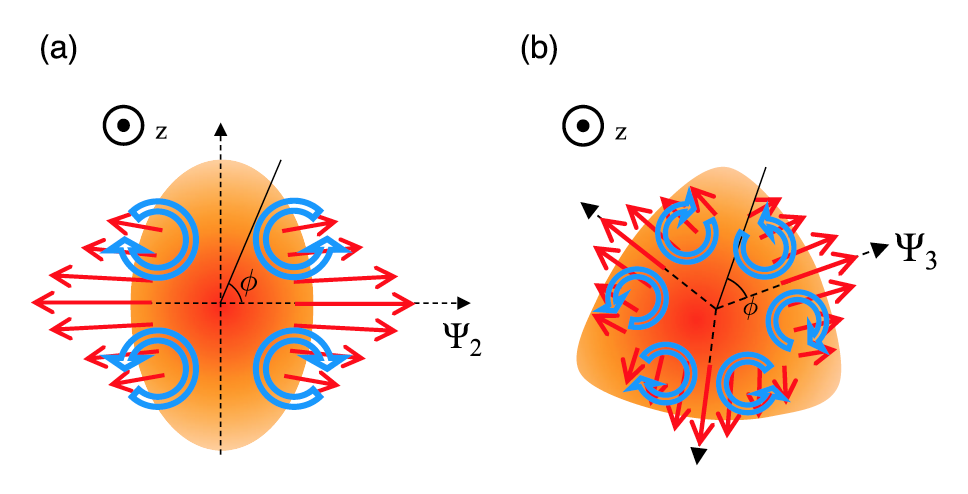 图1:重离子碰撞形成致密物质椭圆流(a)和三角流(b)导致的局域涡旋示意图