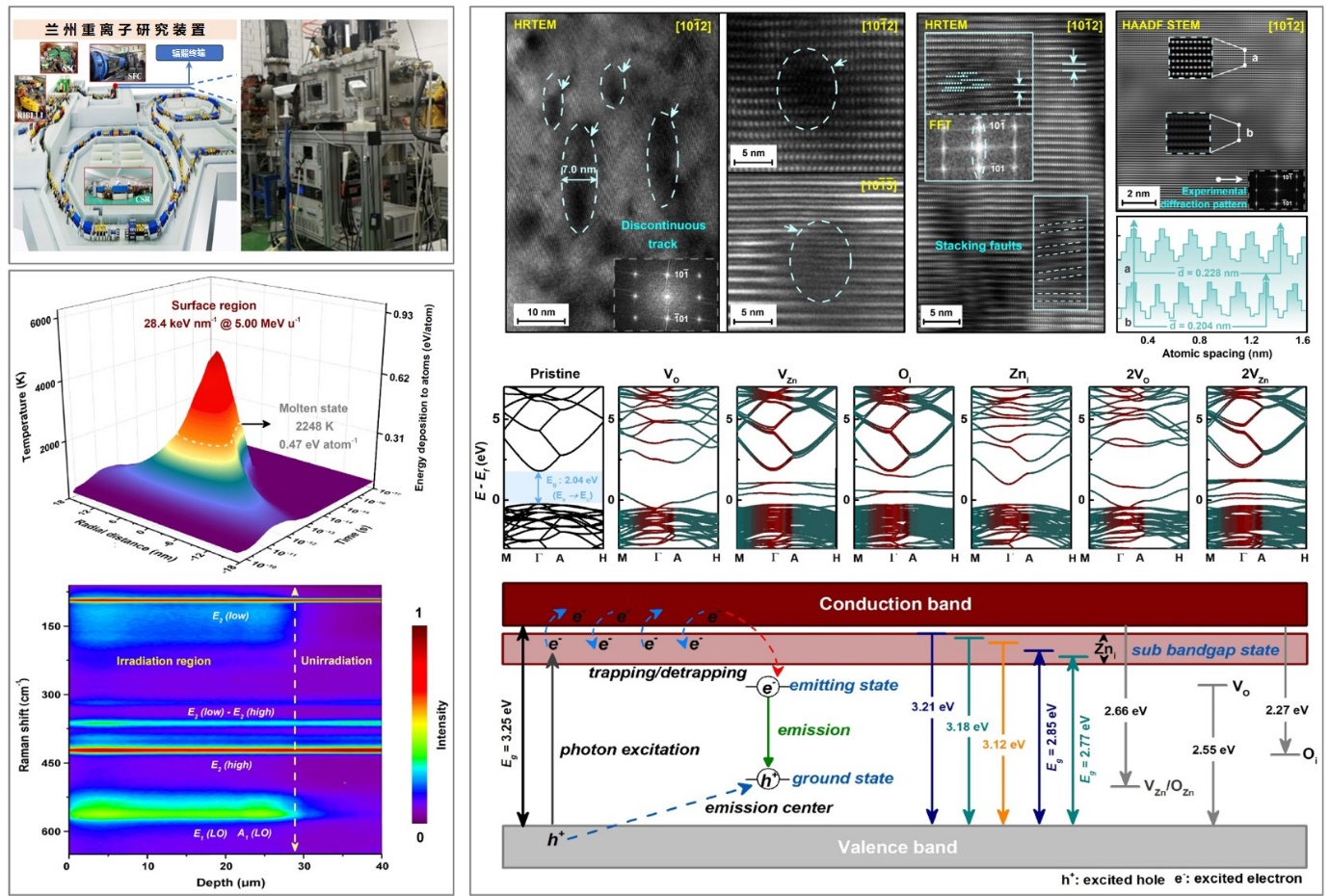 本研究工作从高能重离子辐照引起的强电子激发这一基本作用机制出发,通过电子-电子、电子-声子耦合,产生瞬态的高密度能量沉积效应,诱导晶格熔融并形成核径迹损伤微区;利用多尺度实验表征,结合密度泛函理论计算,建立不同类型的辐照缺陷模型,并确定其形成能、电子结构等,深入理解高能离子与物质的基本作用过程,揭示了核径迹微区内高浓度的空位/间隙缺陷光电特性调控的主导作用阐明了辐照技术所诱导带隙降低及载流子浓度增加等效应的内在机制。