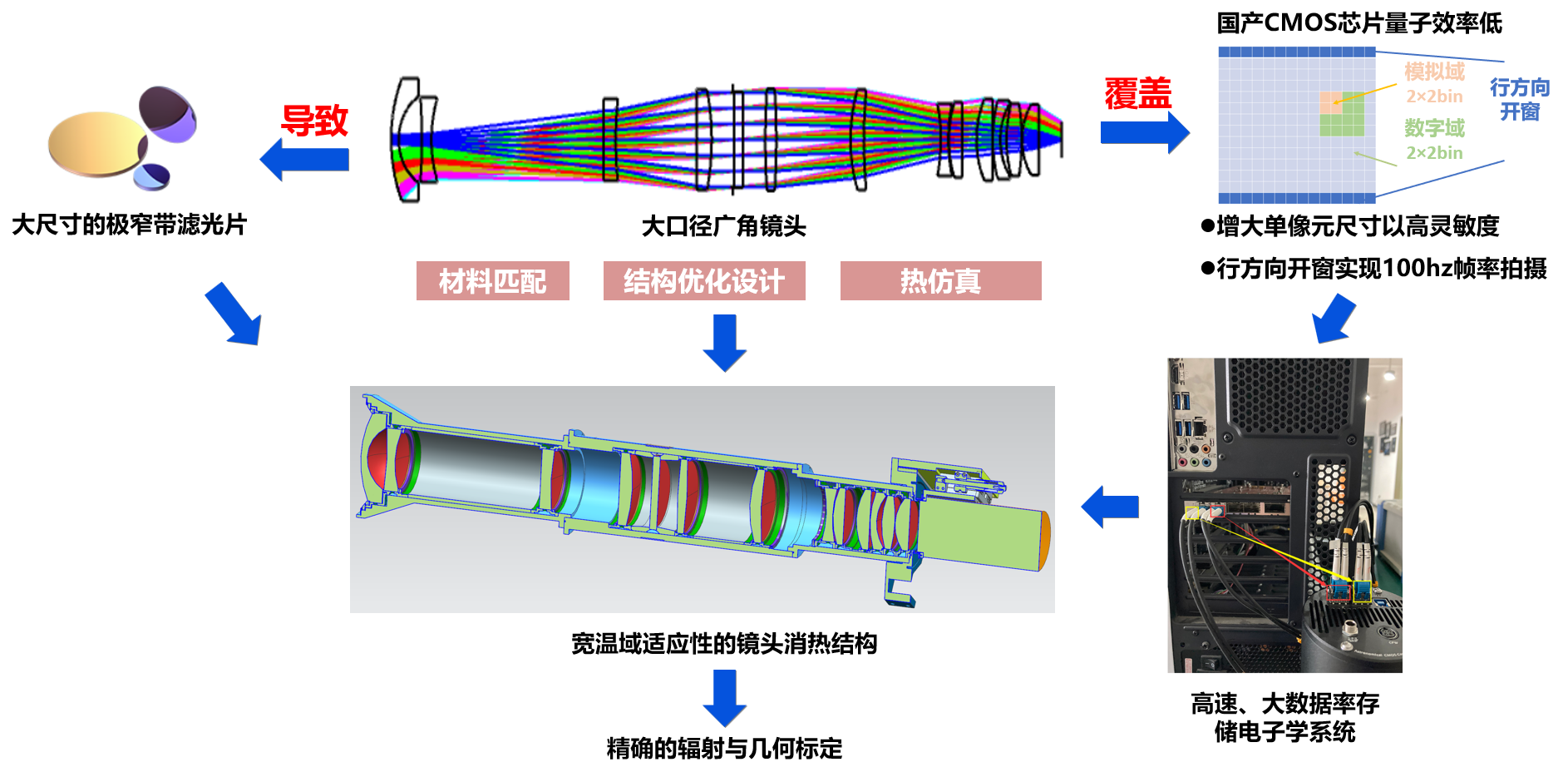 在设计阶段,为了规避芯片禁运给项目带来的技术风险,课题组采用国产CMOS芯片研制相机。相较于进口的EMCCD,国产的CMOS芯片在量子效率和成像帧频上存在一定不足,但是我研制团队通过片上集成和数字域合并的处理方法,实现最高支持100Hz的高速成像,数据率高达2Gbps;同时针对100度大视场角成像需求,设计了长焦距大口径广角镜头,使成像完全覆盖大面阵CMOS芯片,保证成像的高灵敏度。