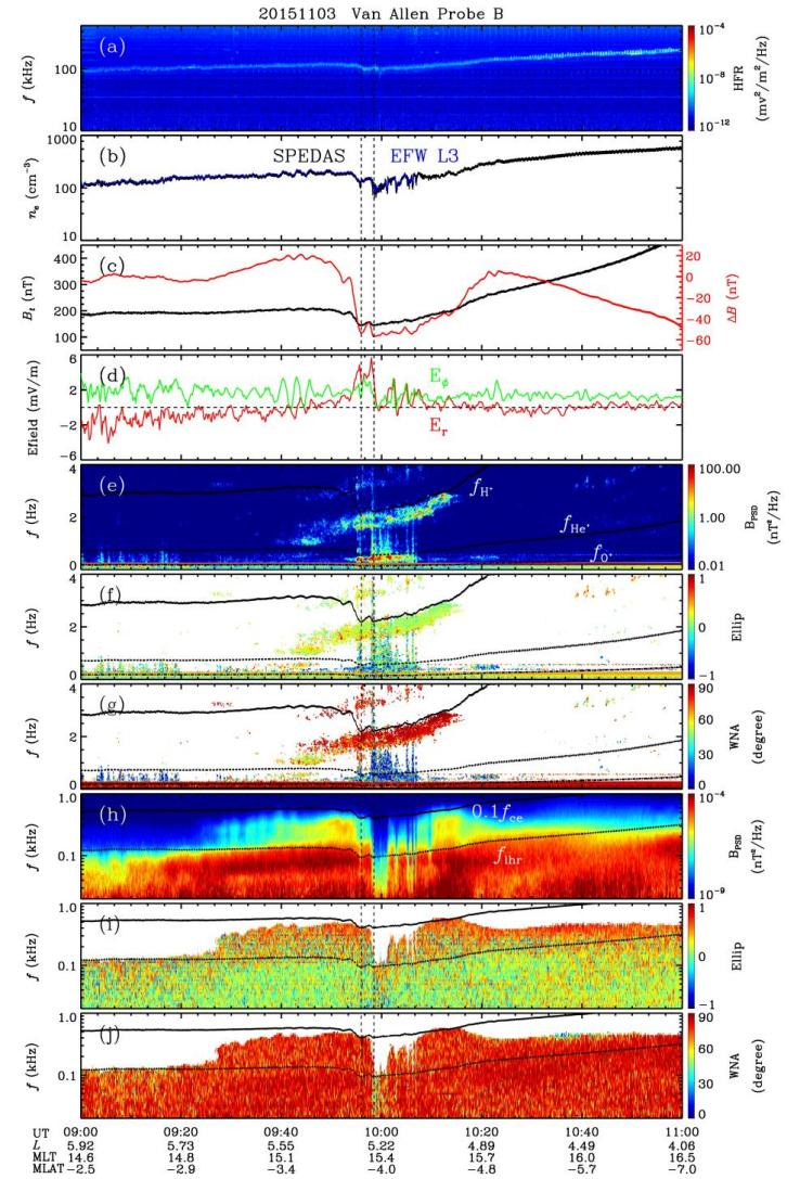 朱辉教授带领课题组成员,基于范艾伦探测器对等离子体和波动的全面观测,首次发现了磁场空洞中与以往认知不同的等离子体波动现象。研究显示,在由环电流质子注入引起的局地磁场强度下降约25%的磁场空洞事件中,同时观测到了预期的EMIC波产生和意外的MS波中断(如图1所示)。通过线性理论估计,我们发现了磁场空洞对EMIC波和MS波活动的不同影响。