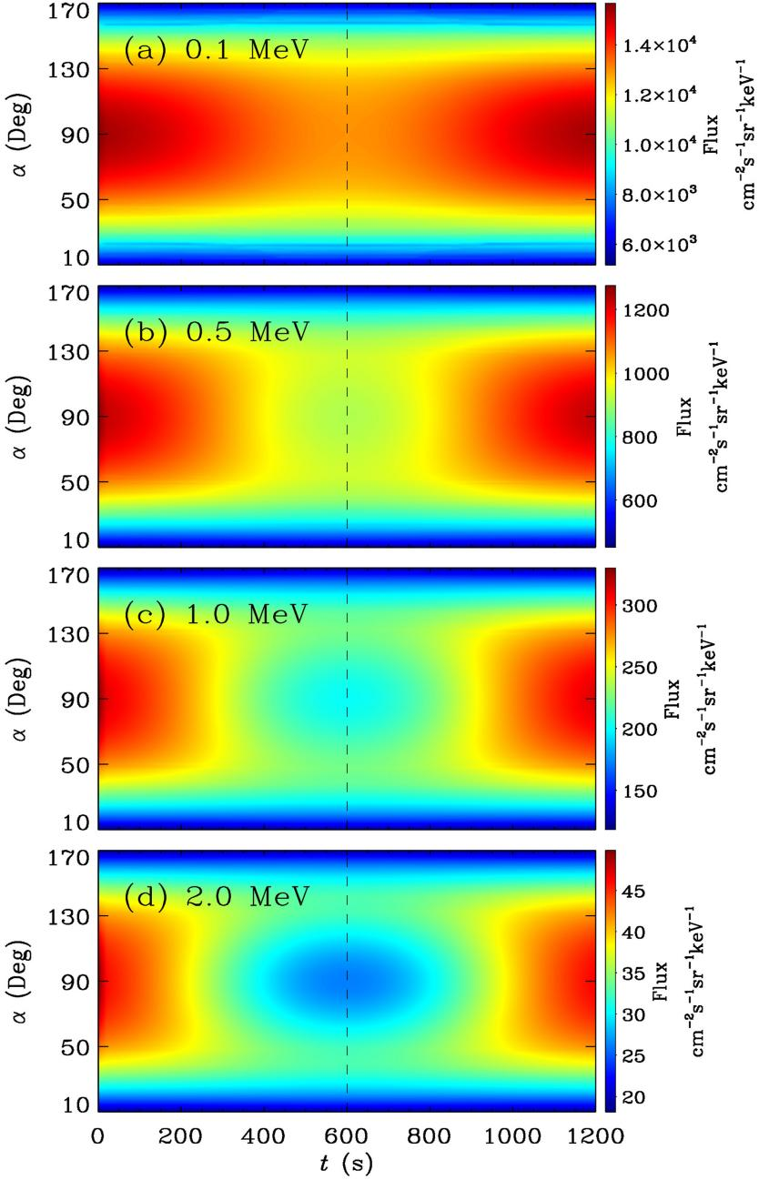 课题组进一步利用范艾伦探测器的长期电子通量观测数据,并结合试验粒子模拟,详细研究了电子投掷角分布在磁场空洞中的演化特征。模拟成功再现了磁场空洞中电子的蝴蝶状投掷角分布(如图2所示),结果表明在相同条件下,能量较高的电子更容易形成蝴蝶状投掷角分布,这与观测结果一致。此外,参数化研究表明,蝴蝶分布的形成受到多种因素影响,包括电子的能量、位置、初始通量分布,以及磁场空洞的位置和深度。特别是,辐射带中背景电子通量的负径向梯度分布对于形成这种特殊的投掷角分布起到了至关重要的作用。该系列工作深化了对磁场空洞与等离子体波活动及电子投掷角分布演化之间相互关系的理解,同时突显了其在环电流-辐射带耦合中的重要作用。