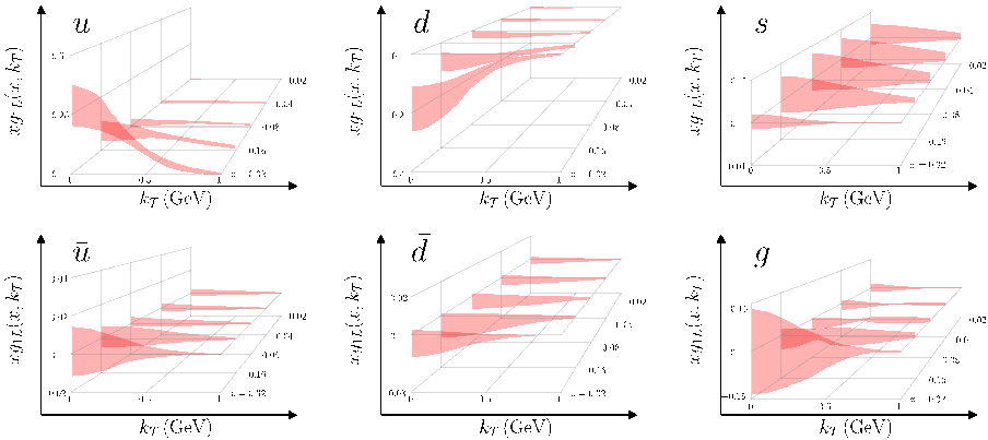 图1:三维螺旋度分布在不同纵动量分数下随横动量的分布,依次为上夸克螺旋度分布、下夸克的螺旋度分布、三种海夸克的螺旋度分布,胶子的螺旋度分布。