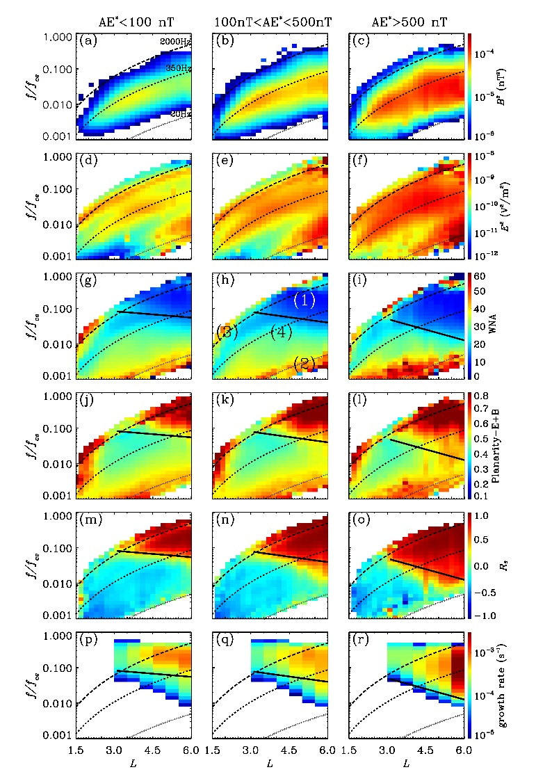 图2:不同地磁活动水平下,嘶声波的功率、传播特性及增长率在L-f/fce中的统计分布