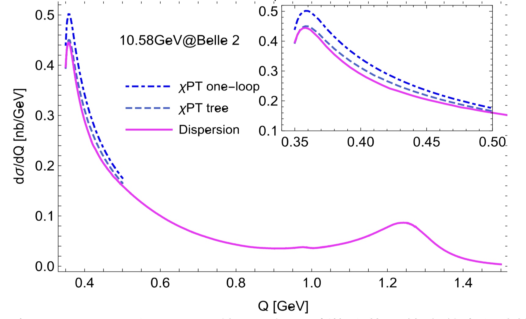 下图:Belle 2 能区π介子对微分截面随不变质量的变化曲线