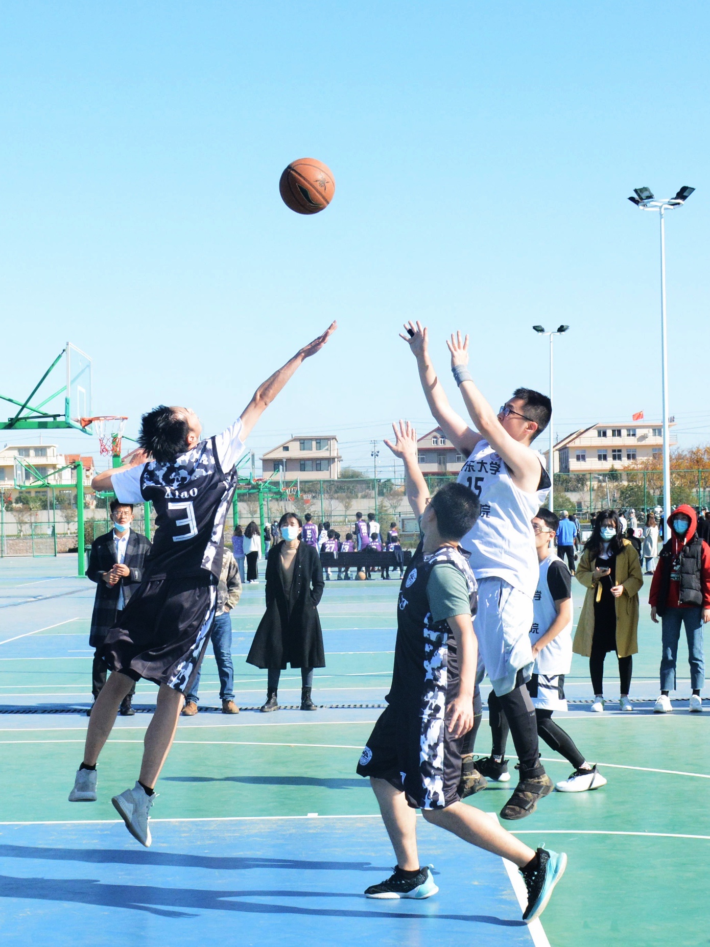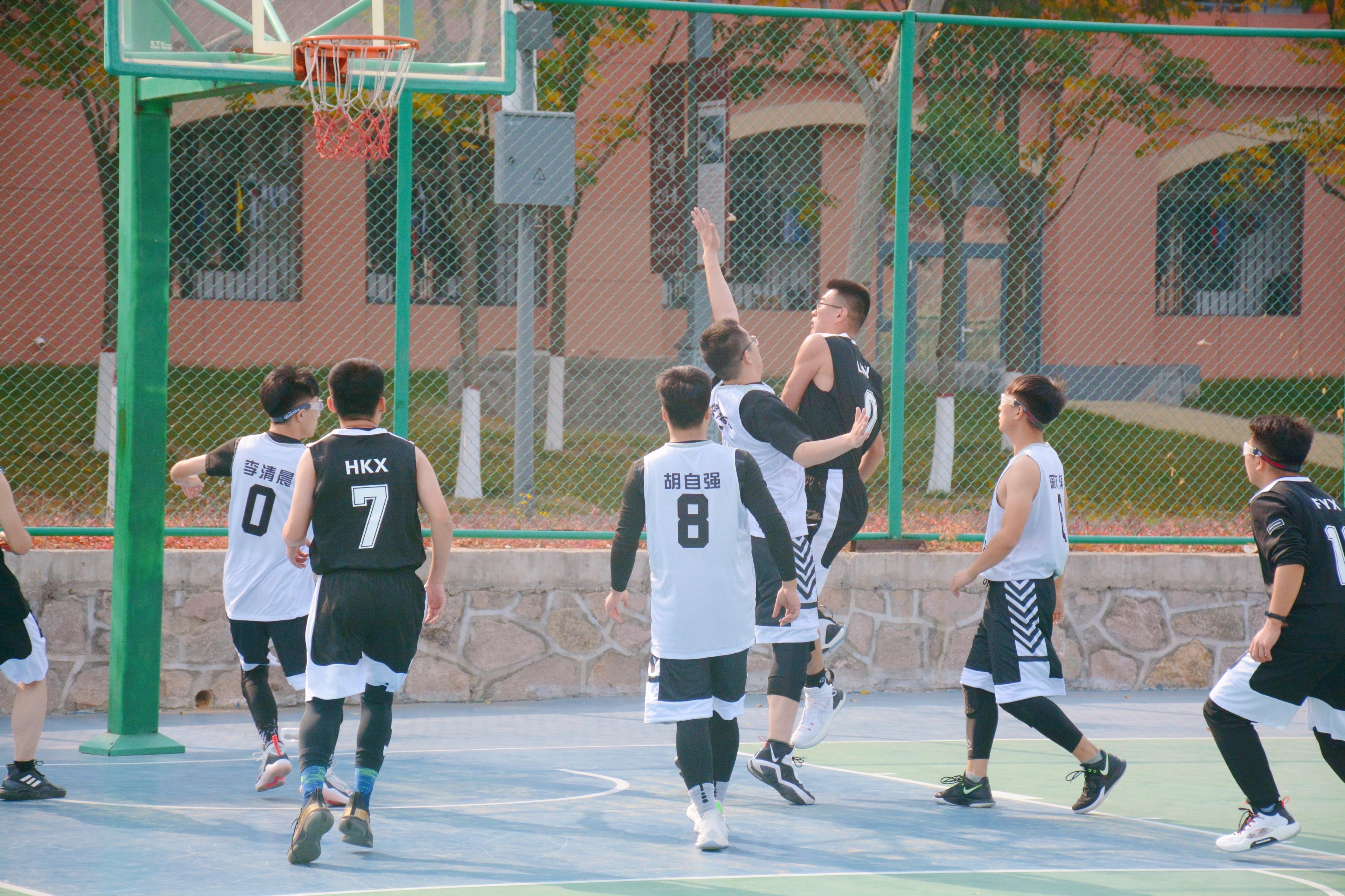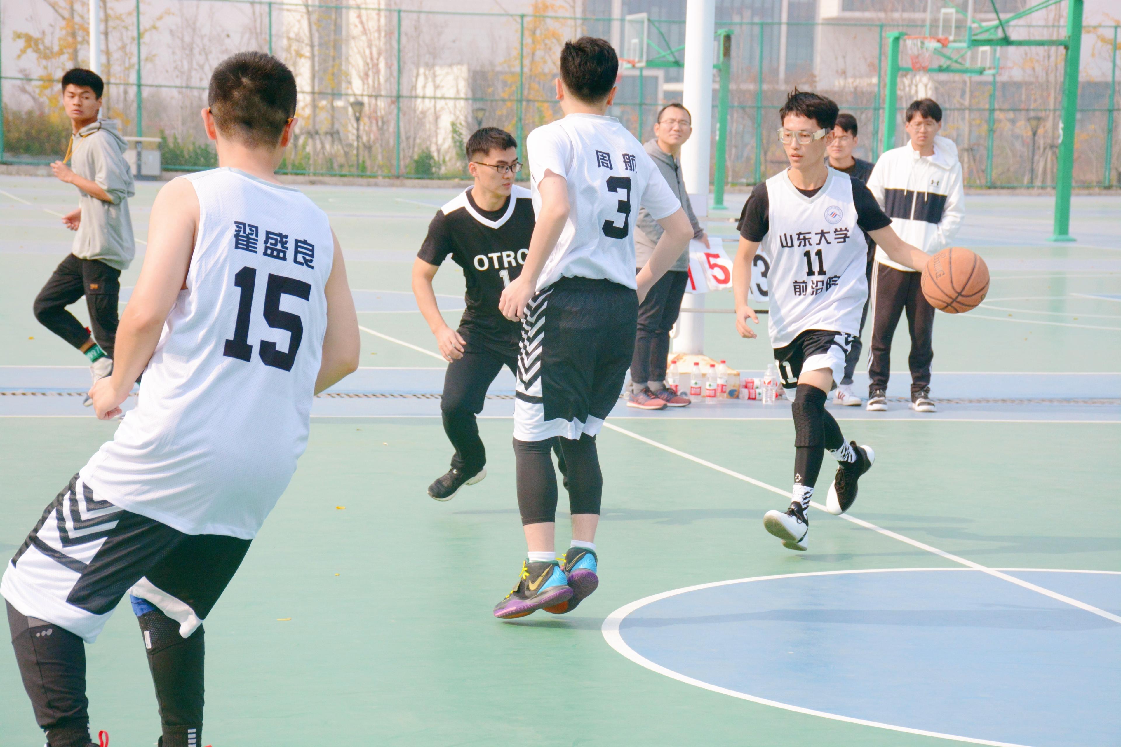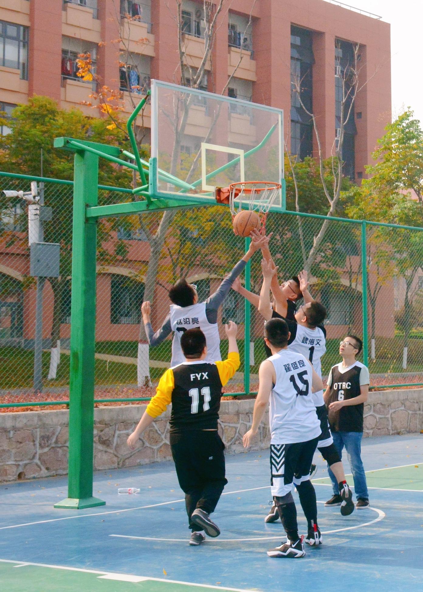比赛即将开始前,球员们摩拳擦掌、斗志高昂,在积极热身的同时讨论战术、分析对手。同时,辛勤的工作人员贴心的为球员们准备了矿泉水;裁判、记录员、计时员、领队等人员已准备就绪;双方球队也来了许多应援人员。哨声响起,裁判将球向空中抛起。双方球员很快进入状态,在咱院球员的相互配合下,比分逐渐领先于对方球队。中场休息后,双方球员恢复了体力,比赛也越来越有激情,用各种各样的篮球技巧和精准的投篮为自己的队伍贡献了一分又一分。